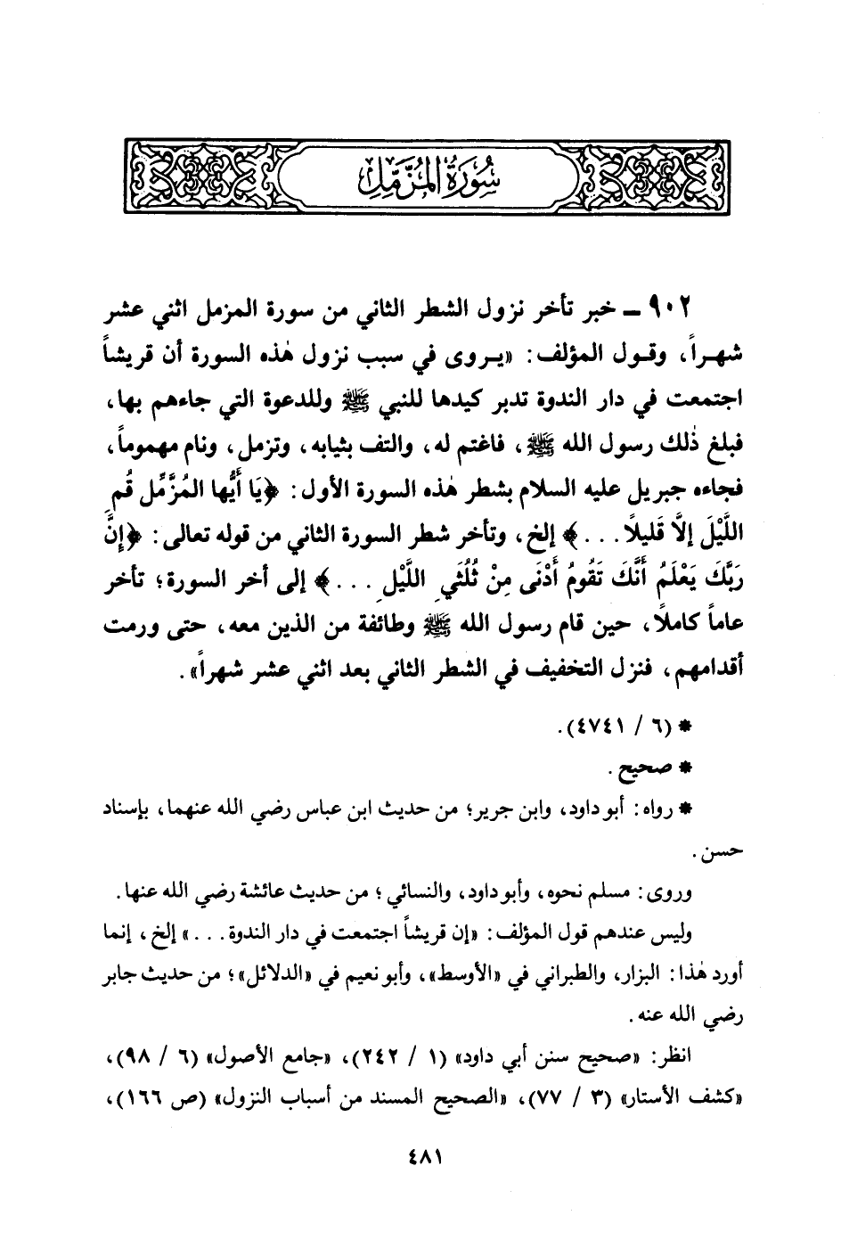 902 - خبر تأخر نزول الشطر الثاني من سورة المزمر اثني عشر شهراً، وقول المؤلف: ((يروى في سبب نزول هذه السورة أن قريشاً اجتمعت في دار الندوة تدبر كيدها للنبي صلى الله عليه وسلم وللدعوة التي جاءهم بها، فبلغ ذلك رسول الله صلى الله عليه وسلم، فاغتم له، والتف بثيابه، وتزمل، ونام مهموماً، فجاءه جبريل عليه السلام بشطر هذه السورة الأول: {يَا أَيُّهَا الْمُزَّمِّلُ قُمِ اللَّيْلَ إِلاَّ قَلِيلاً ... } إلخ، وتأخر شطر السورة الثاني من قوله تعالى: {إِنَّ رَبَّكَ يَعْلَمُ أَنَّكَ تَقُومُ أَدْنَى مِن ثُلُثَيِ اللَّيْلِ ... } إلى آخر السورة؛ تأخر عاماً كاملاً، حين قام رسول الله صلى الله عليه وسلم وطائفة من الذين معه، حتى ورمت أقدامهم، فنزل التخفيف في الشطر الثاني بعد اثني عشر شهراً)) .