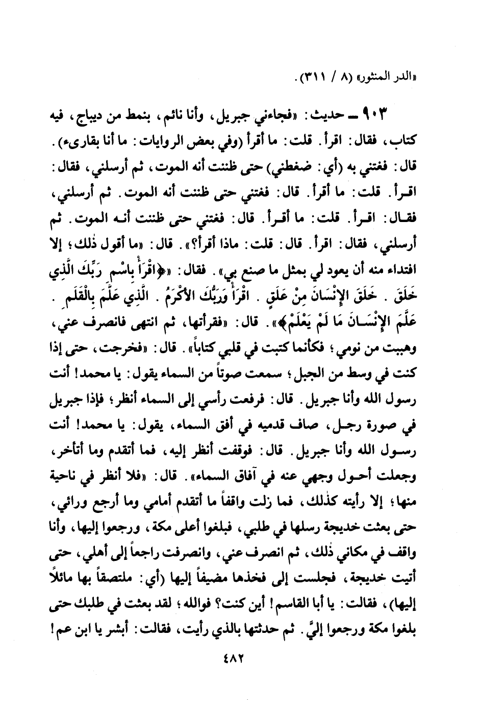 903 - حديث: ((فجاءني جبريل، وأنا نائم، بنمط من ديباج، فيه كتاب، فقال: اقرأ. قلت: ما أقرأ (وفي بعض الروايات: ما أنا بقارئ) . قال: فغتني به (أي: ضغطني) حتى ظننت أنه الموت، ثم أرسلني، فقال: اقرأ. قلت: ما أقرأ. قال: فغتني حتى ظننت أنه الموت، ثم أرسلني فقال: اقرأ. قلت: ما أقرأ. قال: فغتني حتى ظننت أنه الموت، ثم أرسلني فقال: اقرأ. قال: قلت: ماذا أقرأ؟. قال: ((ما أقول ذلك؛ إلا افتداء منه أن يعود لي بمثل ما صنع بي)) . فقال: (( {اقْرَأ بِاسْمِ رَبِّكَ الَّذِي خَلَقَ * خَلَقَ الإِنسَانَ مِنْ عَلَقٍ * اِقْرَأْ وَرَبُّكَ الأَكْرَمُ * الَّذِي عَلَّمَ بِالْقَلَمِ * عَلَّمَ الإِنسَانَ مَا لَمْ يَعْلَمْ} )) . قال: ((فقرأتها، ثم انتهى فانصرف عني، وهببت من نومي؛ فكأنما كتبت في قلبي كتاباً)) . قال: ((فخرجت، حتى إذا كنت في وسط من الجبل؛ سمعت صوتاً من السماء يقول: يا محمد! أنت رسول الله وأنا جبريل. قال: فرفعت رأسي إلى السماء أنظر؛ فإذا جبريل في صورة رجل، صاف قدميه في أفق السماء، يقول: يا محمد! أنت رسول الله وأنا جبريل. قال: فوقفت أنظر إليه، فما أتقدم وما أتأخر، وجعلت أحول وجهي عنه في آفاق السماء)) . قال: ((فلا أنظر في ناحية منها؛ إلا رأيته كذلك، فما زلت واقفاً ما أتقدم أمامي وما أرجع ورائي، حتى بعثت خديجة رسلها في طلبي، فبلغوا أعلى مكة، ورجعوا إليها، وأنا واقف في مكاني ذلك، ثم انصرف عني، وانصرفت راجعاً إلى أهلي، حتى أتيت خديجة، فجلست إلى فخذها مضيفاً إليها (أي: ملتصقاً بها مائلاً إليها) ، فقالت: يا أبا القاسم! أين كنت؟ فوالله؛ لقد بعثت في طلبك حتى بلغوا مكة ورجعوا إليَّ. ثم حدثتها بالذي رأيت، فقالت: أبشر يا ابن عم!
