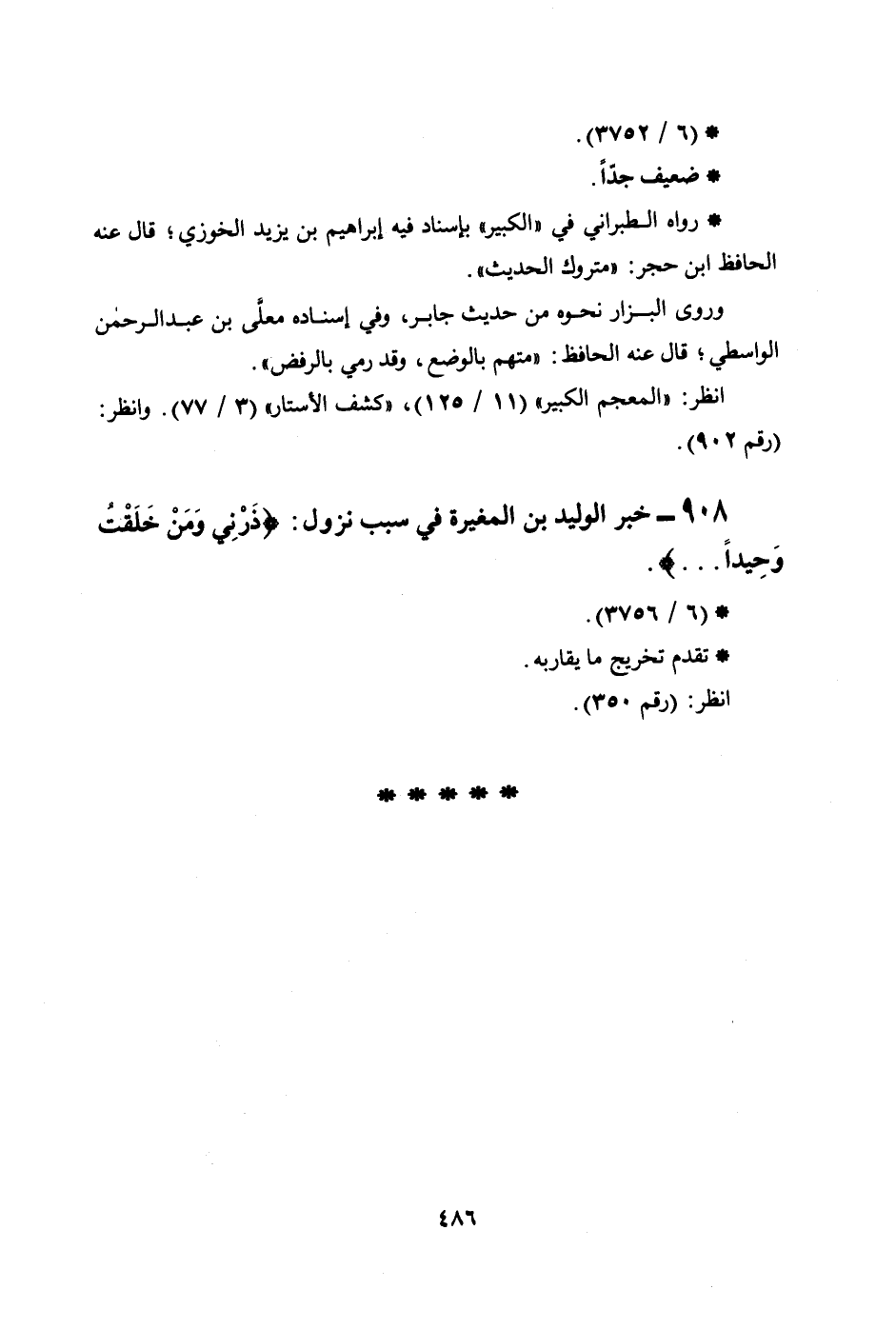 908 - خبر الوليد بن المغيرة في سبب نزول: {ذَرْنِي وَمَنْ خَلَقْتُ وَحِيداً ... } .