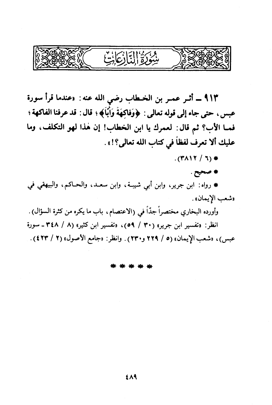 913 - أثر عمر بن الخطاب رضي الله عنه: ((عندما قرأ سورة عبس، حتى جاء إلى قوله تعالى: {وَفَاكِهَةً وَّأَبَّا} ؛ قال: قد عرفنا الفاكهة؛ فما الأب؟ ثم قال: لعمرك يا ابن الخطاب! إن هذا لهو التكلف، وما عليك ألا تعرف لفظاً في كتاب الله تعالى؟!)) .