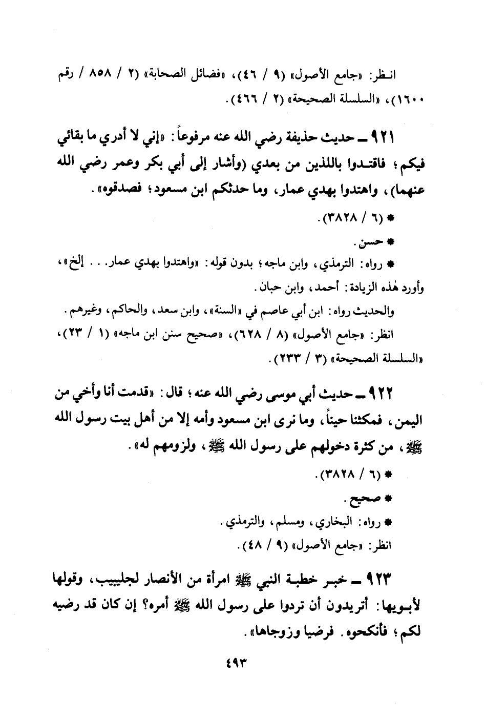 921 - حديث حذيفة رضي الله عنه مرفوعاً: ((إني لا أدري ما بقائي فيكم؛ فاقتدوا باللذين من بعدي (وأشار إلى أبي بكر وعمر رضي الله عنهما) ، واهتدوا بهدي عمار، وما حدثكم ابن مسعود؛ فصدقوه)) .