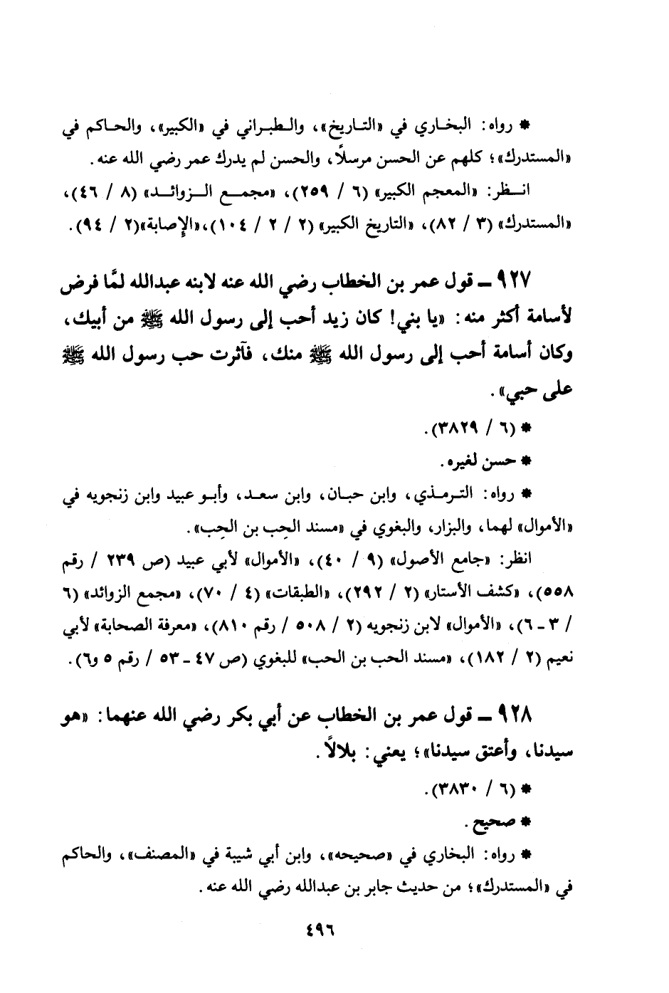 927 - قول عمر بن الخطاب رضي الله عنه لابنه عبد الله لمَّا فرض لأسامة أكثر منه: ((يا بني! كان زيد أحب إلى رسول الله صلى الله عليه وسلم من أبيك، وكان أسامة أحب إلى رسول الله صلى الله عليه وسلم منك، فآثرت حب رسول الله صلى الله عليه وسلم على حبي)) .