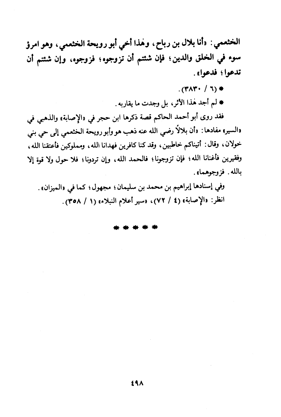 الخثعمي: ((أنا بلال بن رباح، وهذا أخي أبو رويحة الخثعمي، وهو امرؤ سوء في الخلق والدين؛ فإن شئتم أن تزوجوه فزوجوه، وإن شئتم أن تدعوا؛ فدعوا)) .