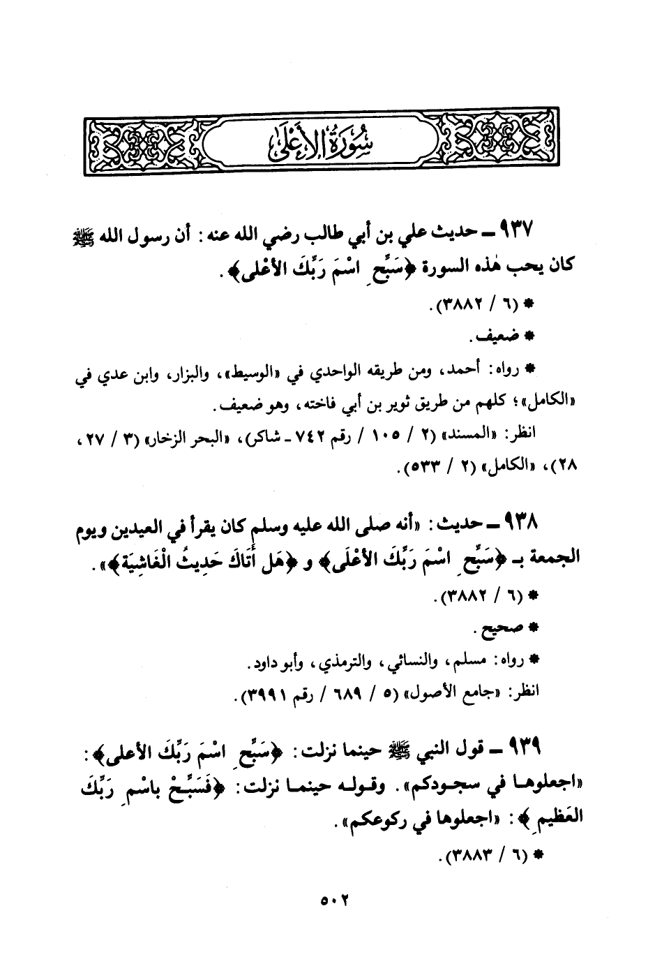 937 - حديث علي بن أبي طالب رضي الله عنه: أن رسول الله صلى الله عليه وسلم كان يحب هذه السورة {سَبِّحِ اسْمَ رَبِّكَ الأَعْلَى} .