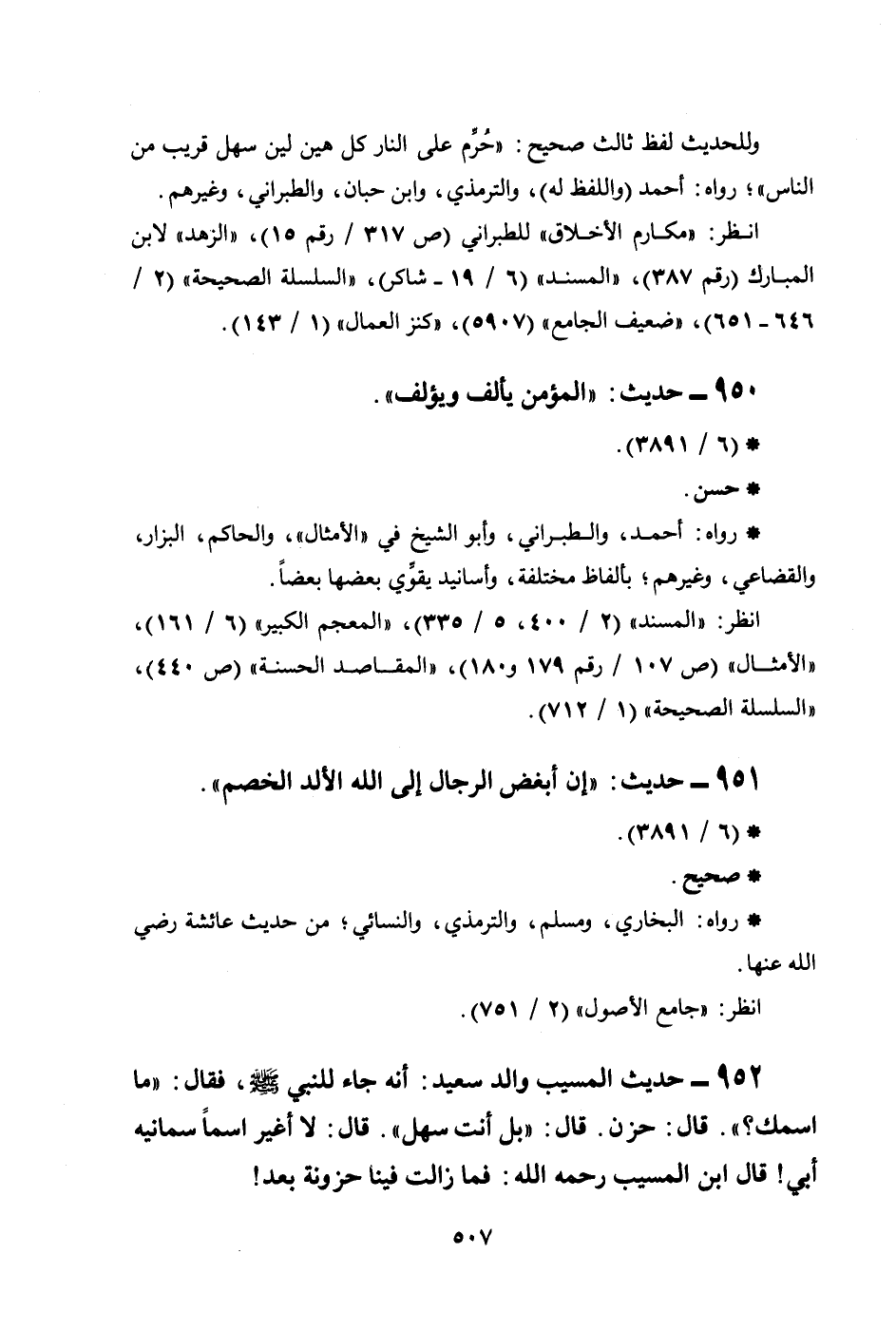 952 - حديث المسيب والد سعيد: أنه جاء للنبي صلى الله عليه وسلم، فقال: ((ما اسمك؟)) . قال: حزن. قال: ((بل أنت سهل)) . قال: لا أغير اسماً سمانيه أبي! قال ابن المسيب رحمه الله: فما زالت فينا حزونة بعد!
