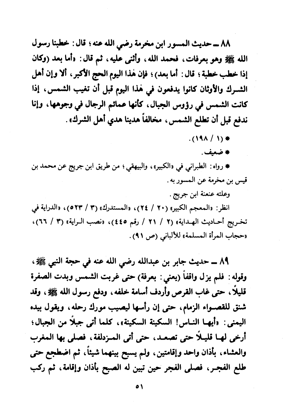 88 - حديث المسور بن مخرمة رضي الله عنه؛ قال: خطبنا رسول الله صلى الله عليه وسلم وهو بعرفات، فحمد الله، وأثنى عليه، ثم قال: ((أما بعد (وكان إذا خطب خطبة؛ قال: أما بعد) ؛ فإن هذا اليوم الحج الأكبر، ألا وإن أهل الشرك والأوثان كانوا يدفعون في هذا اليوم قبل أن تغيب الشمس، إذا كانت الشمس في رؤوس الجبال، كأنها عمائم الرجال في وجوهها، وإنا ندفع قبل أن تطلع الشمس، مخالفاً هدينا هدي أهل الشرك)) .