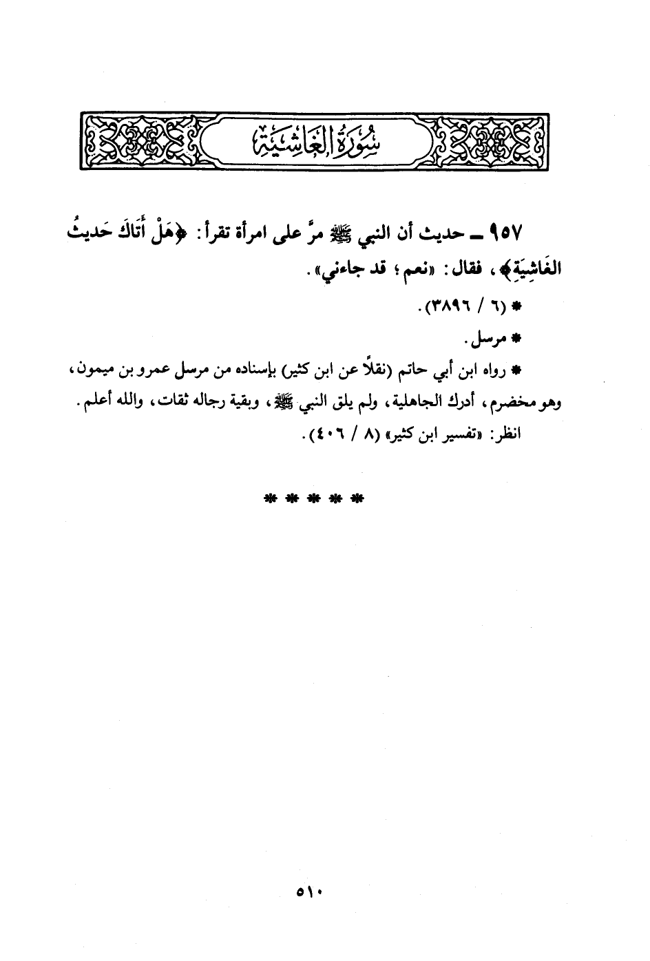 957 - حديث أن النبي صلى الله عليه وسلم مرَّ على امرأة تقرأ: {هَلْ أَتَاكَ حَدِيثُ الْغَاشِيَةِ} ، فقال: ((نعم؛ قد جاءني)) .