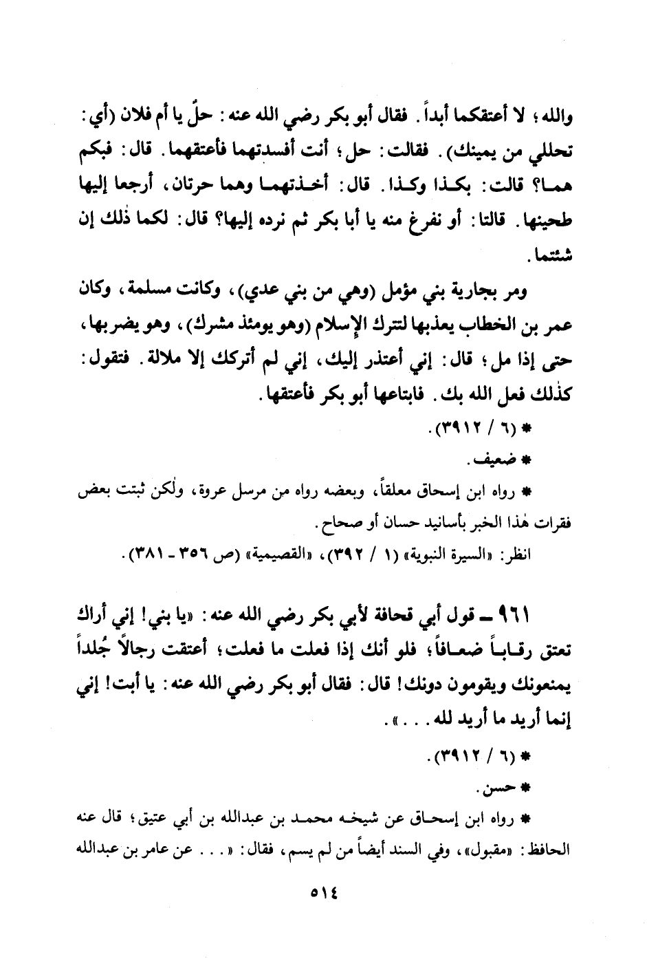 والله؛ لا أعتقكما أبداً. فقال أبو بكر رضي الله عنه: حلُ يا أم فلان (أي تحللي من يمينك) . فقالت: حل؛ أنت أفسدتهما فأعتقهما. قال: فبكم هما؟ قالت: بكذا وكذا. قال: أخذتهما وهما حرتان، أرجعا إليها طحينها. قالتا: أو نفرغ منه يا أبا بكر ثم نرده إليها؟ قال: لكما ذلك إن شئتما.