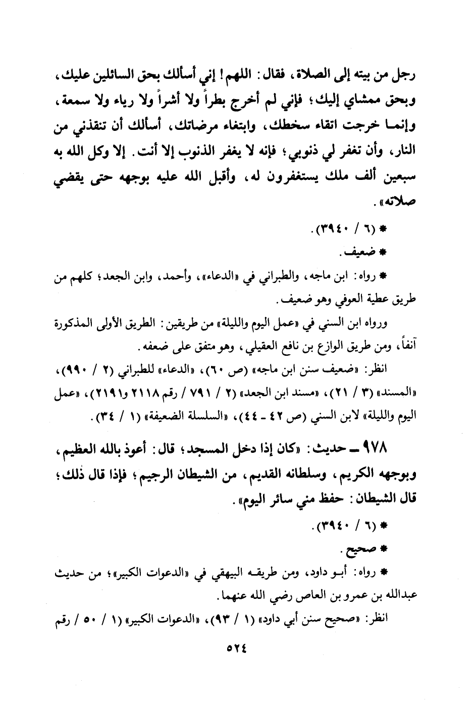 978 - حديث: ((كان إذا دخل المسجد؛ قال: أعوذ بالله العظيم، وبوجهه الكريم، وسلطانه القديم، من الشيطان الرجيم؛ فإذا قال ذلك؛ قال الشيطان: حفظ مني سائر اليوم)) .