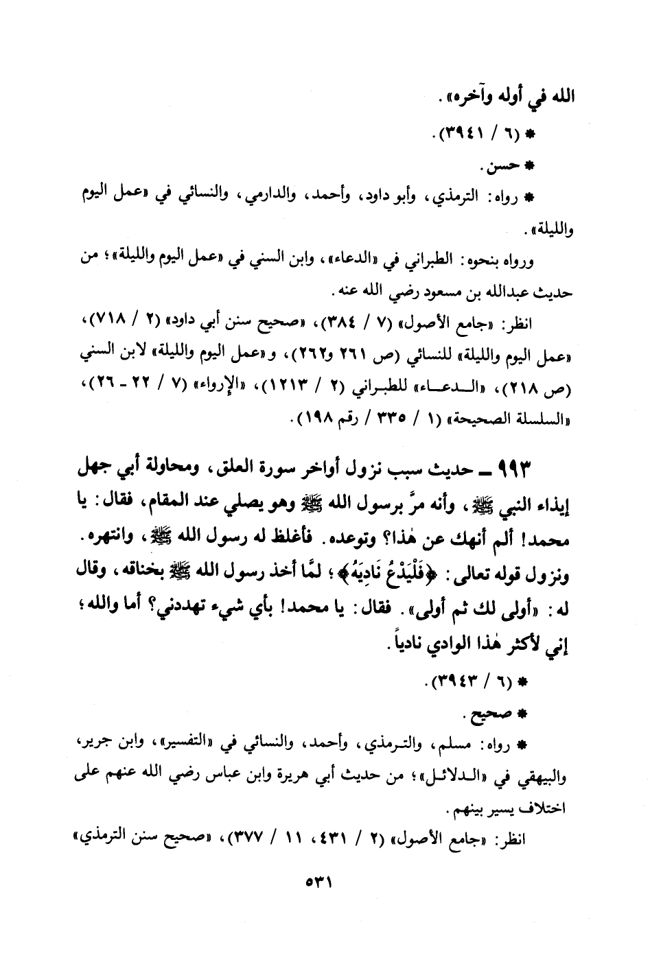 993 - حديث سبب نزول أواخر سورة العلق، ومحاولة أبي جهل إيذاء النبي صلى الله عليه وسلم، وأنه مرَّ برسول الله صلى الله عليه وسلم وهو يصلي عند المقام، فقال: يا محمد! ألم أنهك عن هذا؟ وتوعده. فأغلظ له رسول الله صلى الله عليه وسلم، وانتهره. ونزول قوله تعالى: {فَلْيَدْعُ نَادِيَهُ} ؛ لما أخذ رسول الله صلى الله عليه وسلم بخناقه، وقال له: ((أولى لك ثم أولى)) . فقال: يا محمد! بأي شيء تهددني؟ أما والله؛ إني لأكثر هذا الوادي نادياً.