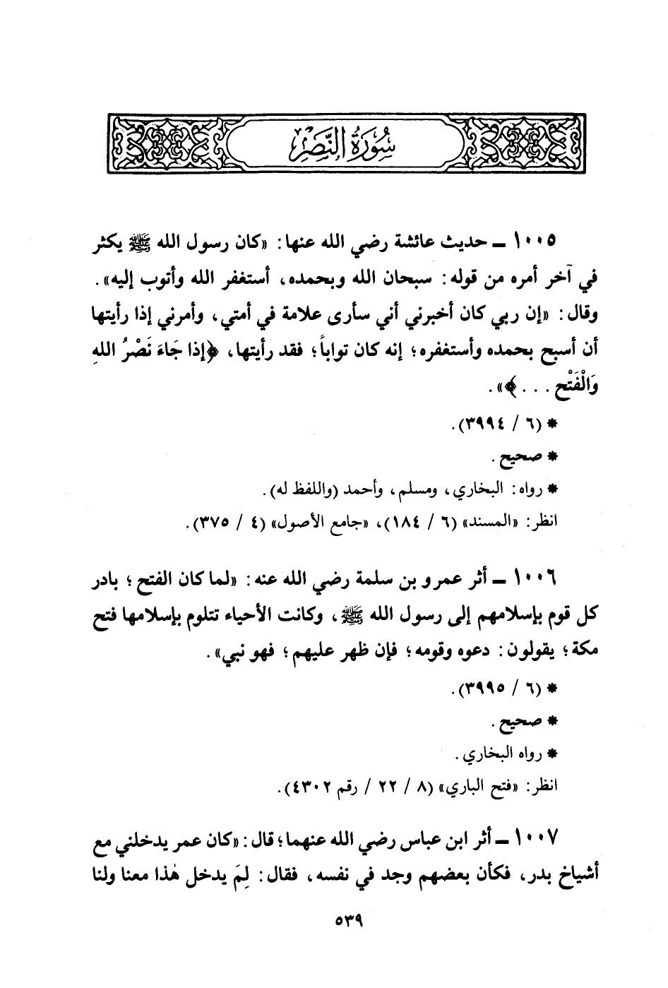 1005 - حديث عائشة رضي الله عنها: ((كان رسول الله صلى الله عليه وسلم يكثر في آخر أمره من قوله: سبحان الله وبحمده، أستغفر الله وأتوب إليه)) . وقال: ((إن ربي كان أخبرني أني سأرى علامة في أمتي، وأمرني إذا رأيتها أن أسبح بحمده وأستغفره؛ إنه كان تواباً؛ فقد رأيتها، {إِذَا جَاءَ نَصْرُ اللهِ وَالْفَتْحُ ... } .