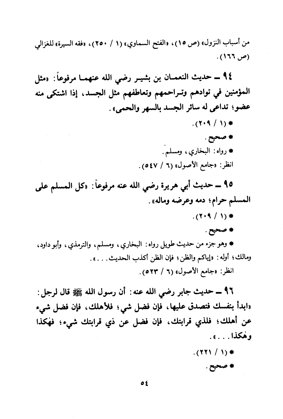 94 - حديث النعمان بن بشير رضي الله عنهما مرفوعاً: ((مثل المؤمنين في توادهم وتراحمهم وتعاطفهم مثل الجسد؛ إذا اشتكى منه عضو؛ تداعى له سائر الجسد بالسهر والحمى)) .