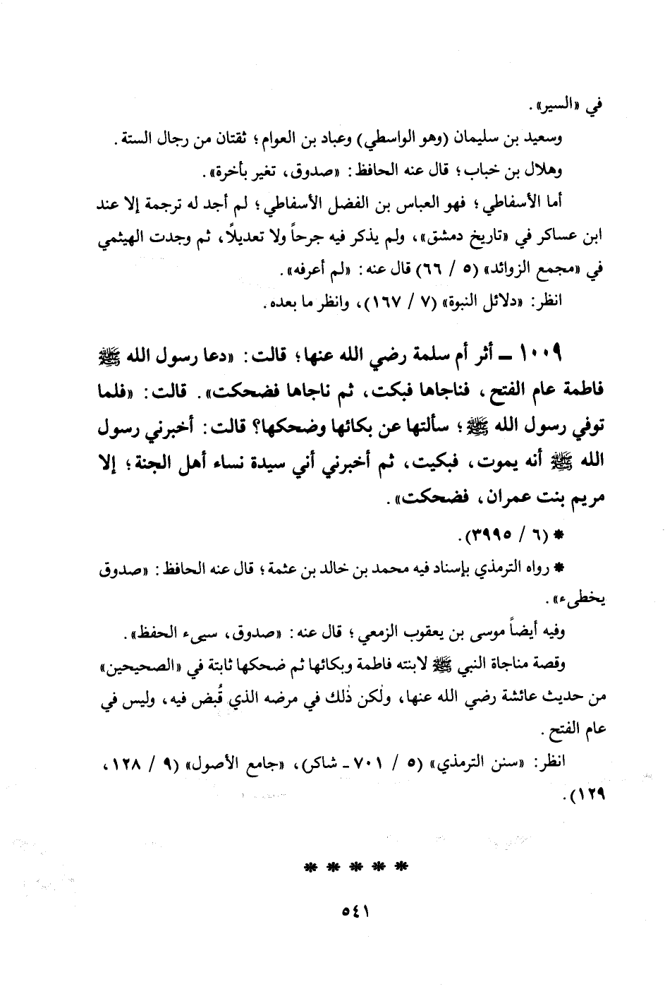 1009 - أثر أم سلمة رضي الله عنها؛ قالت: ((دعا رسول الله صلى الله عليه وسلم فاطمة عام الفتح، فناجاها فبكت، ثم ناجاها فضحكت)) . قالت: ((فلما توفي رسول الله صلى الله عليه وسلم؛ سألتها عن بكائها وضحكها؟ قالت: أخبرني رسول الله صلى الله عليه وسلم أنه يموت فبكيت، ثم أخبرني أني سيدة نساء أهل الجنة؛ إلا مريم بنت عمران، فضحكت)) .