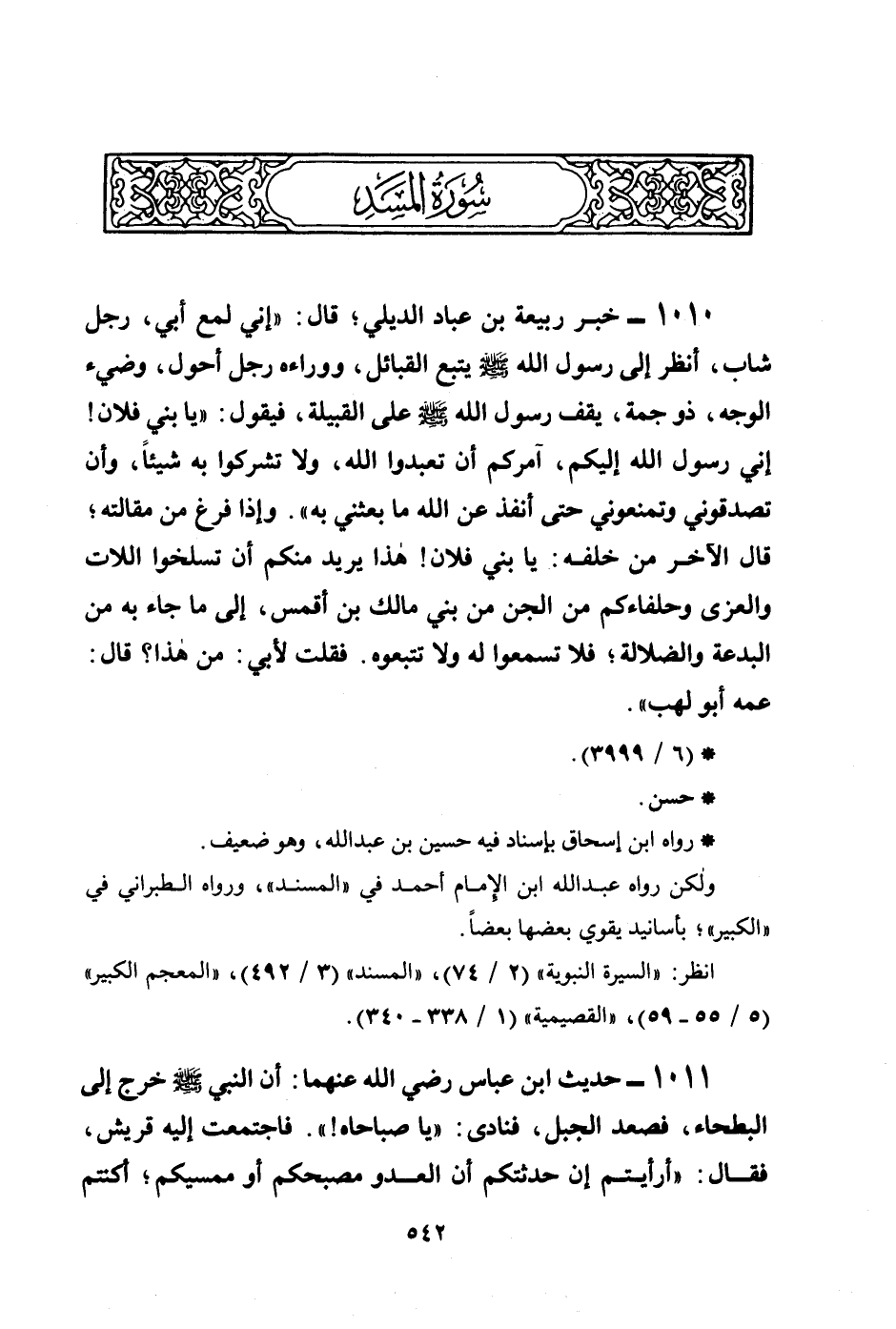 1010 - خبر ربيعة بن عباد الديلي؛ قال: ((إني لمع أبي، رجل شاب، أنظر إلى رسول الله صلى الله عليه وسلم يتبع القبائل، ووراءه رجل أحول، وضيء الوجه، ذو جمة، يقف رسول الله صلى الله عليه وسلم على القبيلة، فيقول: ((يا بني فلان! إني رسول الله إليكم، آمركم أن تعبدوا الله، ولا تشركوا به شيئاً، وأن تصدقوني وتمنعوني حتى أنفذ عن الله ما بعثني به)) . وإذا فرغ من مقالته؛ قال الآخر من خلفه: يا بني فلان! هذا يريد منكم أن تسلخوا اللات والعزى وحلفاءكم من الجن من بني مالك بن أقمس إلى ما جاء به من البدعة والضلالة؛ فلا تسمعوا له ولا تتبعوه. فقلت لأبي: من هذا؟ قال: عمه أبو لهب)) .
