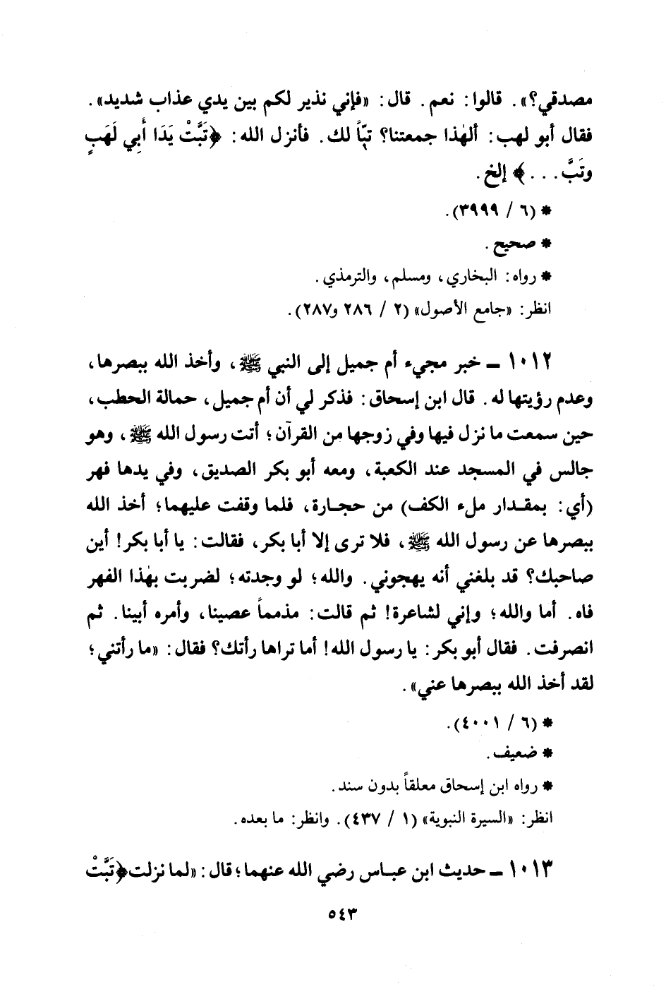 1012 - خبر مجيء أم جميل إلى النبي صلى الله عليه وسلم، وأخذ الله ببصرها، وعدم رؤيتها له، قال ابن إسحاق: فذكر لي أن أم جميل، حمالة الحطب، حين سمعت ما نزل فيها وفي زوجها من القرآن؛ أتت رسول الله صلى الله عليه وسلم، وهو جالس في المسجد عند الكعبة، ومعه أبو بكر الصديق، وفي يدها فهر (أي: بمقدار ملء الكف) من حجارة، فلما وقفت عليهما؛ أخذ الله ببصرها عن رسول الله صلى الله عليه وسلم، فلا ترى إلا أبا بكر، فقالت: يا أبا بكر! أين صاحبك؟ قد بلغني أنه يهجوني. والله؛ لو وجدته؛ لضربت بهذا الفهر فاه. أما والله؛ وإني لشاعرة! ثم قالت: مذمماً عصينا، وأمره أبينا. ثم انصرفت. فقال أبو بكر: يا رسول الله! أما تراها رأتك؟ فقال: