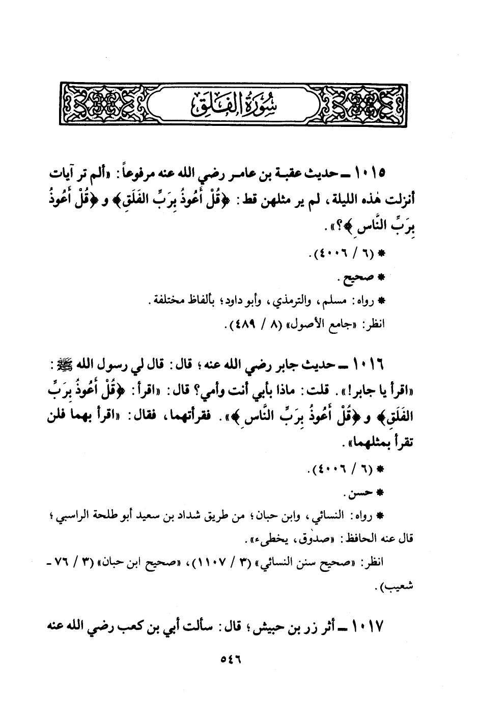 1015 - حديث عقبة بن عامر رضي الله عنه مرفوعاً: ((ألم تر آيات أنزلت هذه الليلة، لم يرَ مثلهن قط: {قُلْ أَعُوذُ بِرَبِّ الْفَلَقِ} و {قُلْ أَعُوذُ بِرَبِّ النَّاسِ} ؟)) .