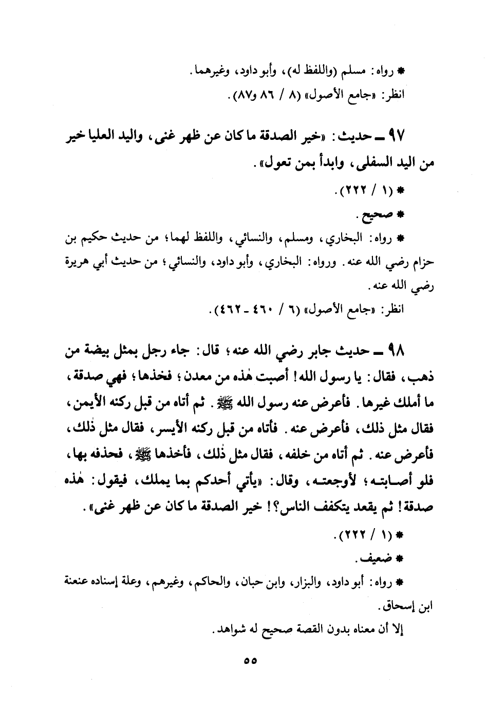 98 - حديث جابر رضي الله عنه؛ قال: جاء رجل بمثل بيضة من ذهب، فقال: يا رسول الله! أصبتُ هذه من معدن؛ فخذها؛ فهي صدقة، ما أملك غيرها، فأعرضَ عنه رسول الله صلى الله عليه وسلم، ثم أتاه من قِبَل ركنه الأيمن، فقال مثل ذلك، فأعرض عنه. فأتاه من قبَلِ ركنه الأيسر، فقال مثل ذلك فأعرض عنه. ثم أتاه من خلفه، فقال مثل ذلك، فأخذها صلى الله عليه وسلم، فحذفه بها، فلو أصابته؛ لأوجعته، وقال: ((يأتي أحدكم بما يملك، فيقول: هذه صدقة! ثم يقعد يتكفف الناس؟! خير الصدقة ما كان عن ظهر غنى)) .