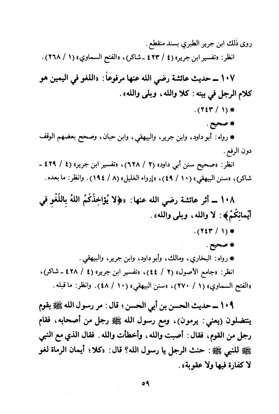 109 - حديث الحسن بن أبي الحسن؛ قال: مرَّ رسول الله صلى الله عليه وسلم بقوم ينتضلون (يعني: يرمون) ، ومع رسول الله صلى الله عليه وسلم رجل من أصحابه، فقام رجل من القوم، فقال: أصبت والله، وأخطأت والله. فقال الذي مع النبي صلى الله عليه وسلم للنبي صلى الله عليه وسلم: حنث الرجل يا رسول الله؟ قال: ((كلا؛ أيمان الرماة لغو لا كفارة فيها ولا عقوبة)) .