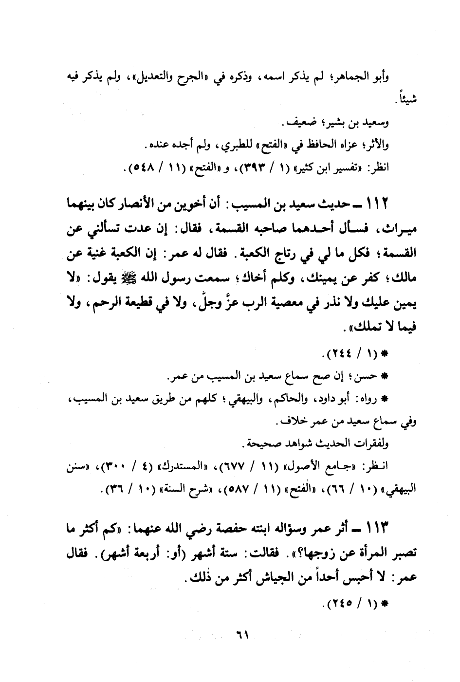 112 - حديث سعيد بن المسيب: أن أخوين من الأنصار كان بينهما ميراث، فسأل أحدهما صاحبه القسمة، فقال: إن عدت تسألني عن القسمة؛ فكل ما لي في رتاج الكعبة. فقال له عمر: إن الكعبة غنية عن مالك؛ كفِّر عن يمينك، وكلم أخاك؛ سمعت رسول الله صلى الله عليه وسلم يقول: ((لا يمين عليك ولا نذر في معصية الرب عزَّ وجلَّ، ولا في قطيعة الرحم، ولا فيما لا تملك)) .