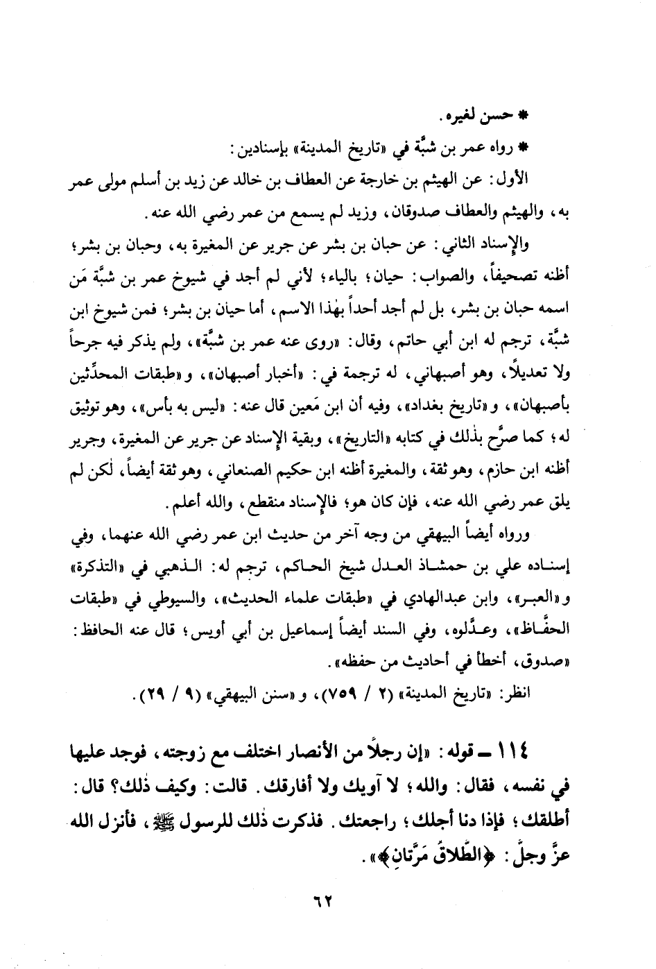 والإسناد الثاني: عن حبان بن بشر عن جرير عن المغيرة به، وحبان ابن بشر؛ أظنه تصحيفاً، والصواب: حيان؛ بالياء، لأني لم أجد في شيوخ عمر بن شبَّة من اسمه حبان بن بشر، بل لم أجد أحداً بهذا الاسم، أما حيان بن بشر؛ فمن شيوخ ابن شبَّة، ترجم له ابن أبي حاتم، وقال: ((روى عنه عمر بن شبَّة)) ، ولم يذكر فيه جرحاً ولا تعديلاً، وهو أصبهاني، له ترجمة في: ((أخبار أصبهان)) ، و ((طبقات المحدثين بأصبهان)) ، و ((تاريخ بغداد)) ، وفيه أن ابن معين قال عنه: ((ليس به بأس)) ، وهو توثيق له؛ كما صرَّح بذلك في كتابه ((التاريخ)) ، وبقية الإسناد عن جرير عن المغيرة، وجرير أظنه ابن حازم، وهو ثقة، والمغيرة أظنه ابن حكيم الصنعاني، وهو ثقة أيضاً، لكن لم يلقَ عمر رضي الله عنه، فإن كان هو فالإسناد منقطع، والله أعلم.