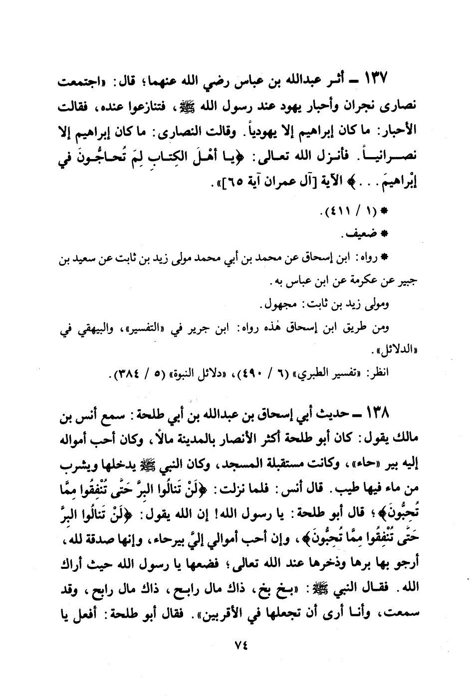 137 - أثر عبد الله بن عباس رضي الله عنهما؛ قال: ((اجتمعت نصارى نجران وأحبار يهود عند رسول الله صلى الله عليه وسلم، فتنازعوا عنده، فقالت الأحبار: ما كان إبراهيم إلا يهودياً. وقالت النصارى: ما كان إبراهيم إلا نصرانياً، فأنزل الله تعالى: {يَا أهْلَ الْكِتَابِ لِمَ تُحَاجَّونَ فِي إِبْرَاهِيمَ..} الآية [آل عمران آية 65] )) .