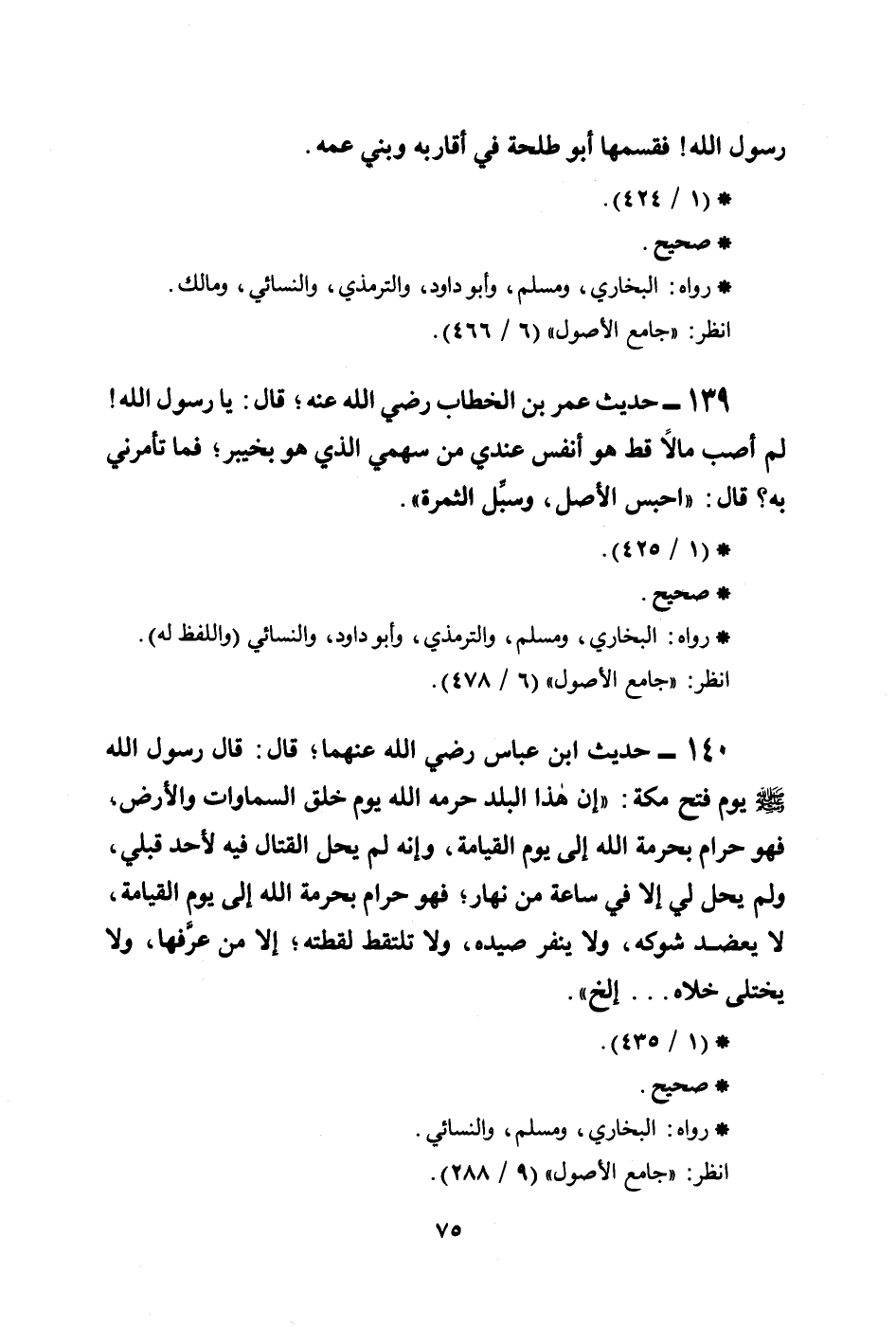 140 - حديث ابن عباس رضي الله عنهما؛ قال: قال رسول الله صلى الله عليه وسلم يوم فتح مكة: ((إن هذا البلد حرمه الله يوم خلق السماوات والأرض، فهو حرام بحرمة الله إلى يوم القيامة، وإن لم يحل القتال فيه لأحد قبلي، ولم يحل لي إلا في ساعة من نهار؛ فهو حرام بحرمة الله إلى يوم القيامة، لا يعضد شوكه، ولا ينفر صيده، ولا تلتقط لقطته؛ إلا من عرَّفها، ولا يختلى خلاه.. إلخ)) .