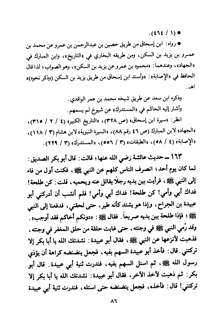163 - حديث عائشة رضي الله عنها؛ قالت: قال أبو بكر الصديق: لما كان يوم أحد؛ انصرف الناس كلهم عن النبي صلى الله عليه وسلم، فكنت أول من فاء إلى النبي صلى الله عليه وسلم، فرأيت بين يديه رجلاً يقاتل عنه ويحميه، قلت: كن طلحة! فداك أبي وأمي! كن طلحة! فداك أبي وأمي! فلم أنشب أن أدركني أبو عبيدة بن الجراح، وإذا هو يشتد كأنه طير، حتى لحقني، فدفعنا إلى النبي صلى الله عليه وسلم؛ فإذا طلحة بين يديه صريعاً. فقال صلى الله عليه وسلم: ((دونكم أخاكم فقد أوجب)) . وقد رُمي النبي صلى الله عليه وسلم في وجنته، حتى غابت حلقة من حلق المغفر في وجنته، فذهبت لأنزعها عن النبي صلى الله عليه وسلم، فقال أبو عبيدة: نشدتك الله يا أبا بكر إلا تركتني. قال: فأخذ أبو عبيدة السهم بفيه، فجعل ينضنضه كراهة أن يؤذي رسول الله صلى الله عليه وسلم، ثم استل السهم بفيه، فندرت ثنية أبي عبيدة. قال أبو بكر: ثم ذهبت لآخذ الآخر، فقال أبو عبيدة: نشدتك الله يا أبا بكر إلا تركتني! قال: فأخذه، فجعل ينضنضه حتى استله، فندرت ثنية أبي عبيدة