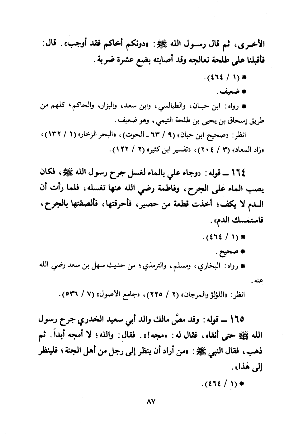 الأخرى، ثم قال رسول الله صلى الله عليه وسلم: ((دونكم أخاكم فقد أوجب)) . قال: فأقبلنا على طلحة نعالجه وقد أصابته بضع عشرة ضربة.