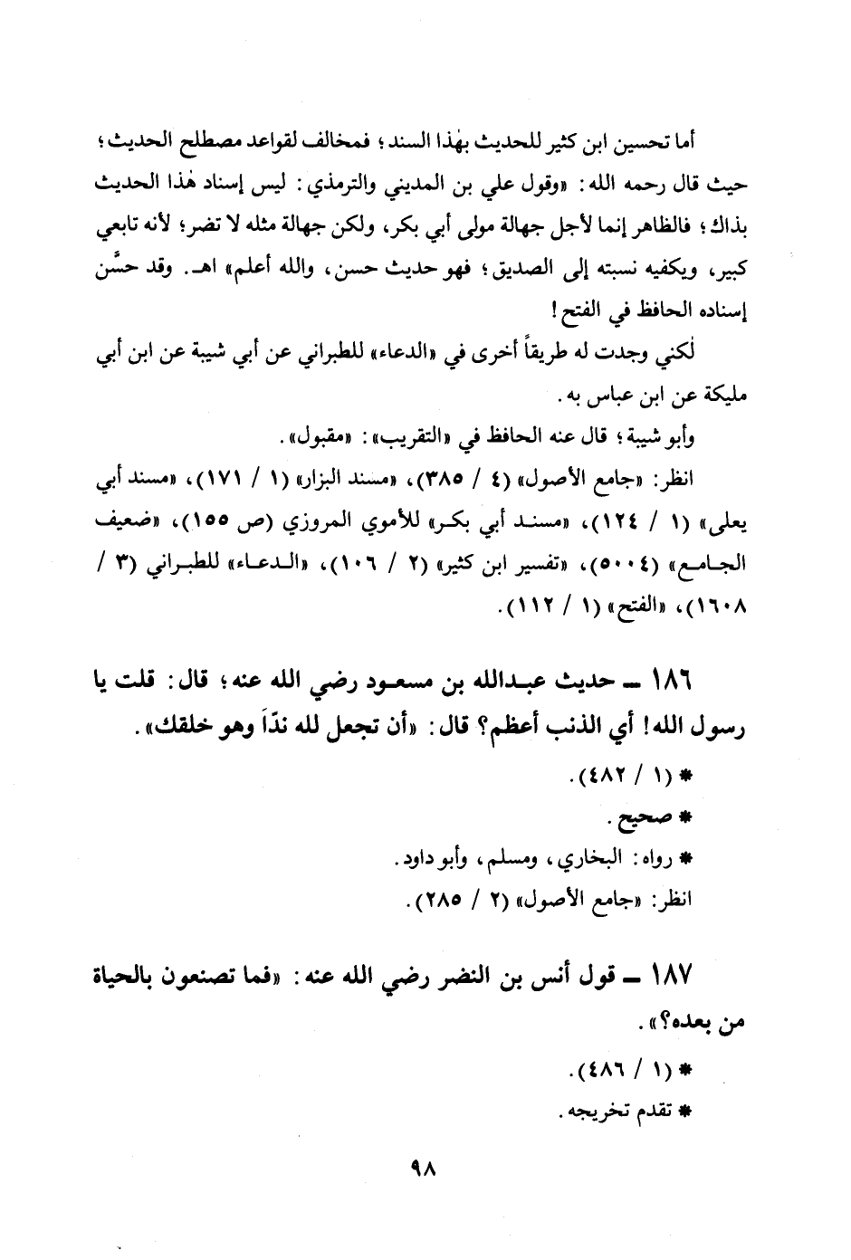 186 - حديث عبد الله بن مسعود رضي الله عنه؛ قال: قلت يا رسول الله! أي الذنب أعظم؟ قال: ((أن تجعل لله تندَّاً وهو خلقك)) .