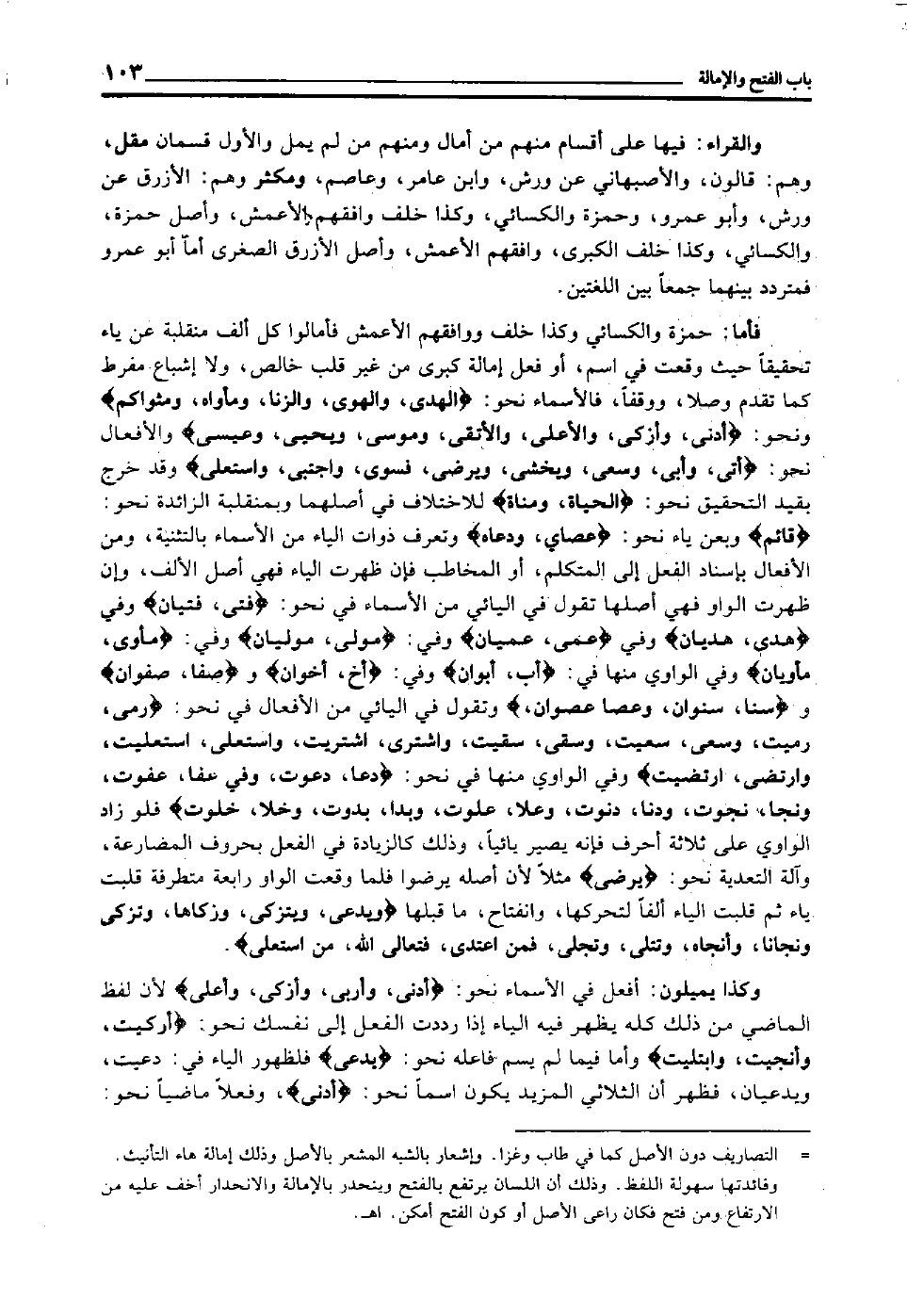 وكذا يميلون: أفعل في الأسماء نحو: "أدنى، وأربى، وأزكى، وأعلى" لأن لفظ الماضي من ذلك كله يظهر فيه الياء إذا رددت الفعل إلى نفسك نحو: "أركيت، وأنجيت، وابتليت" وأما فيما لم يسم فاعله نحو: "يدعى" فلظهور الياء في: دعيت ويدعيان فظهر أن الثلاثي المزيد يكون اسما نحو: "أدنى"، وفعلا ماضيا نحو: