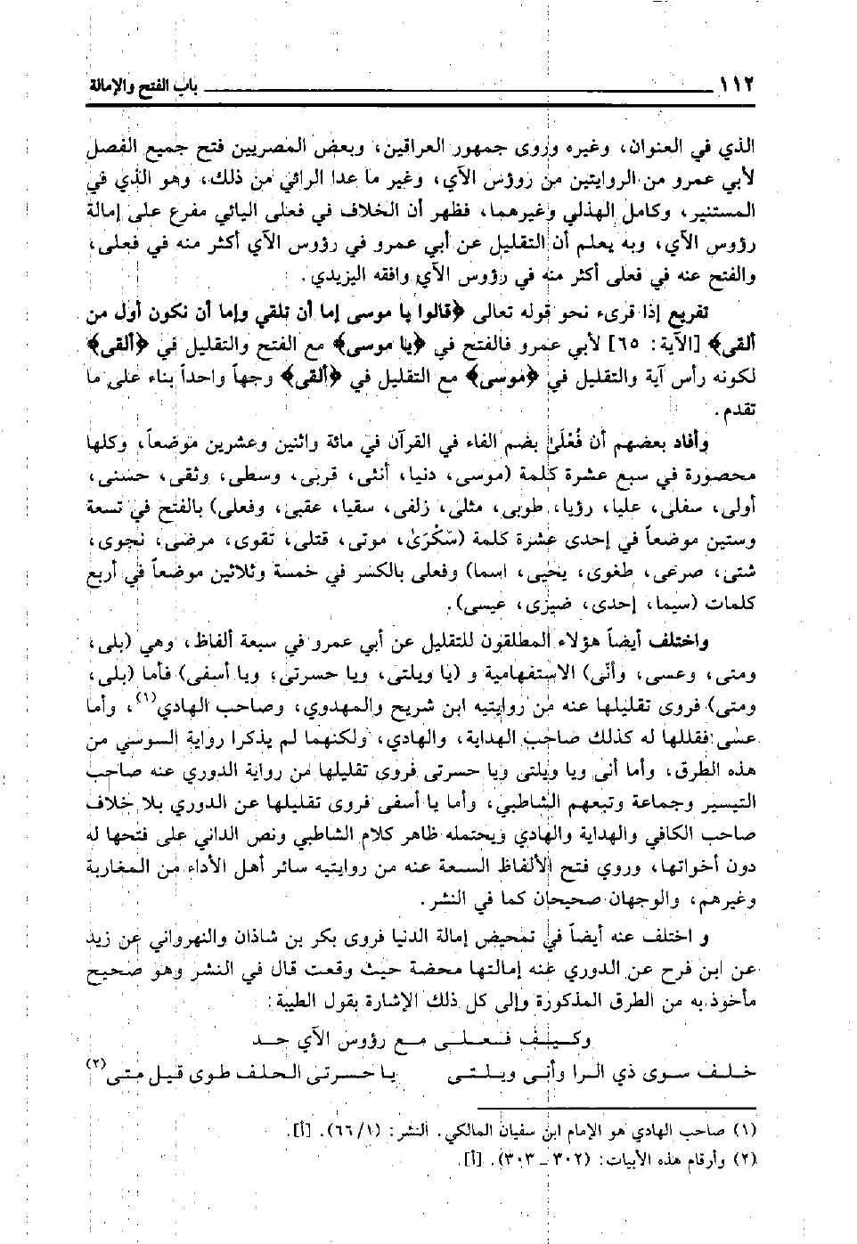 واختلف أيضا هؤلاء المطلقون للتقليل عن أبي عمرو في سبعة ألفاظ وهي "بلى, ومتى, وعسى, وأنى" الاستفهامية و"يا ويلتى، ويا حسرتى، ويا أسفى" فأما "بلى ومتى" فروى تقليلها عنه من روايتيه ابن شريح والمهدوي، وصاحب الهادي1، وأما عسى فقللها له كذلك صاحب الهداية والهادي, ولكنهما لم يذكرا رواية السوسي من هذه الطرق, وأما أنى ويا ويلتي ويا حسرتى فروى تقليلها من رواية الدوري عنه صاحب التيسير وجماعة, وتبعهم الشاطبي, وأما يا أسفى فروى تقليلها عن الدوري بلا خلاف صاحب الكافي والهداية والهادي, ويحتمله ظاهر كلام الشاطبي, ونص الداني على فتحها له دون أخواتها, وروي فتح الألفاظ السبعة عنه من روايتيه سائر أهل الأداء من المغاربة وغيرهم, والوجهان صحيحان كما في النشر.