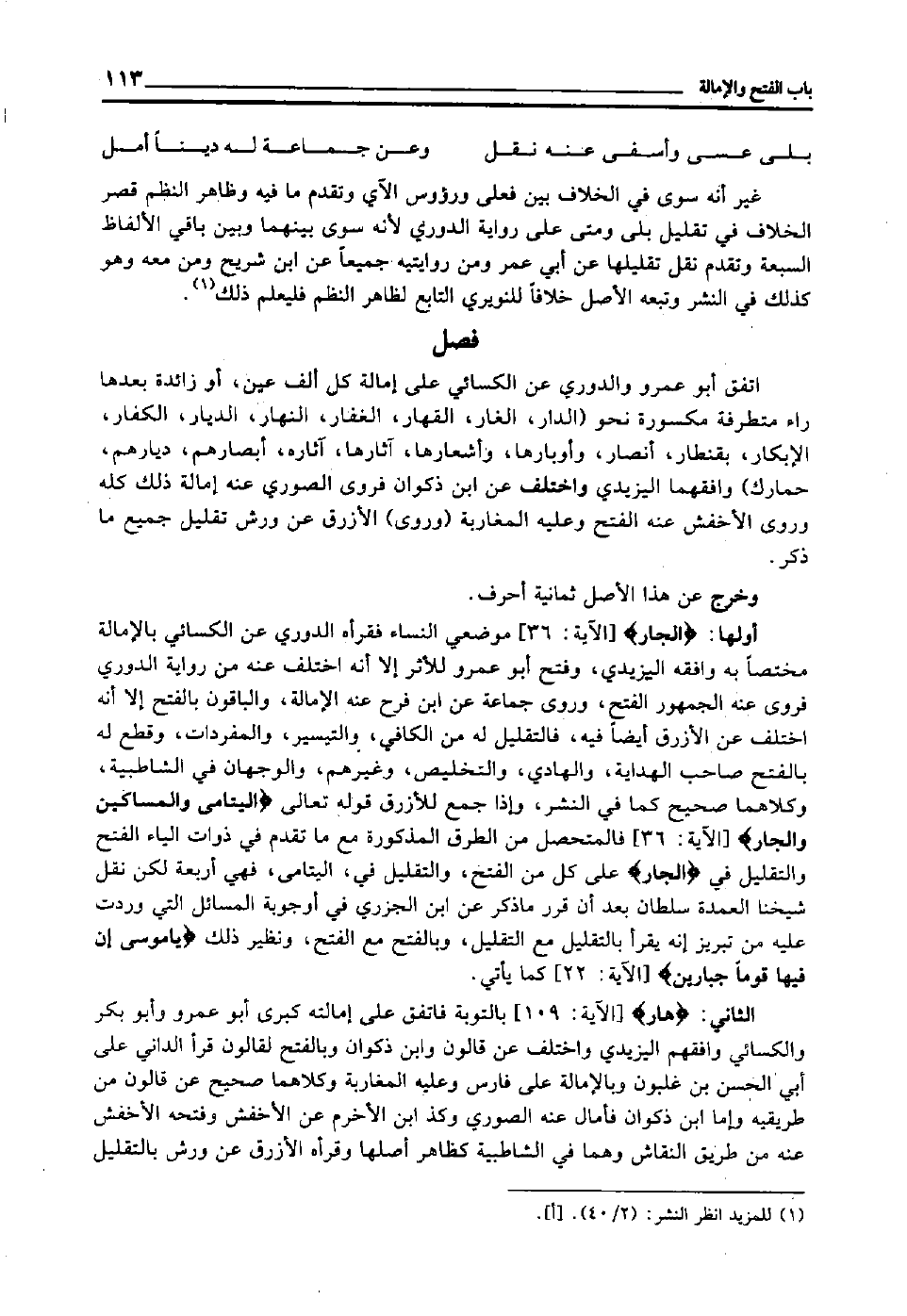 غير أنه سوى في الخلاف بين فعلى ورءوس الآي, وتقدم ما فيه وظاهر النظم قصر الخلاف في تقليل بلى ومتى على رواية الدوري؛ لأنه سوى بينهما وبين باقي الألفاظ السبعة وتقدم نقل تقليلها عن أبي عمر ومن روايتيه جميعا عن ابن شريح ومن معه وهو كذلك في النشر وتبعه الأصل خلافا للنويري التابع لظاهر النظم فليعلم ذلك 1.