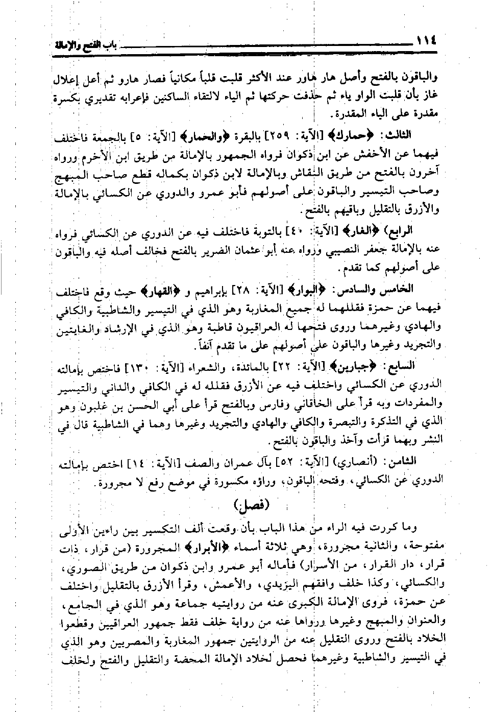 الخامس والسادس: "البوار" [الآية 28: بإبراهيم] و"القهار" حيث وقع فاختلف فيهما عن حمزة فقللهما له جميع المغاربة, وهو الذي في التيسير والشاطبية والكافي والهادي وغيرهما, وروى فتحها له العراقيون قاطبة, وهو الذي في الإرشاد والغايتين والتجريد وغيرها والباقون على أصولهم على ما تقدم آنفا.