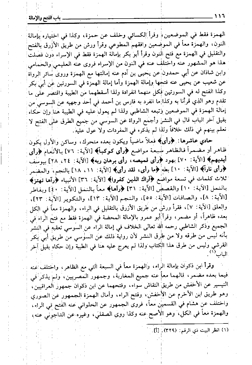 حادي عاشرها: "رأى" فعلا ماضيا ويكون بعده متحرك وساكن, والأول يكون ظاهر أو مضمرا فالظاهر سبعة مواضع "رَأى كَوْكَبًا" [الآية: 76 بالأنعام] "رَأى أَيْدِيَهُم" [الآية: 70 بهود] "رأى قميصه، رأى برهان ربه" [الآية: 24، 28 بيوسف] "رَأى نَارًا" [الآية: 10 بطه] "ما رأى، لقد رأى" [الآية: 11، 18 بالنجم] والمضمر ثلاث كلمات في تسعة مواضع "رَآكَ الَّذِينَ كَفَرُوا" [الأنبياء الآية: 36] "رَآهَا تَهْتَز" [النمل الآية: 10] و [القصص الآية: 31] "رآها" معا بـ[النمل الآية: 40] و [بفاطر الآية: 8] و [الصافات الآية: 55] و [النجم الآية: 13] و [التكوير الآية: 23] و [العلق الآية: 7] فقرأ ورش من طريق الأزرق بالتقليل في الراء والهمزة معا في الكل بعده ظاهرا أو مضمرا وقرأ أبو عمرو بالإمالة المحضة في الهمزة فقط مع فتح الراء في الجميع, وذكر الشاطبي رحمه الله تعالى الخلاف في إمالة الراء عن السوسي تعقبه في النشر بأنه ليس من طرقه ولا من طرق النشر؛ لأن رواية ذلك عن السوسي من طريق أبي بكر القرشي وليس من طرق هذا الكتاب, ولذا لم يعرج عليه هنا في الطيبة وإن حكاه بقيل آخر الباب1.