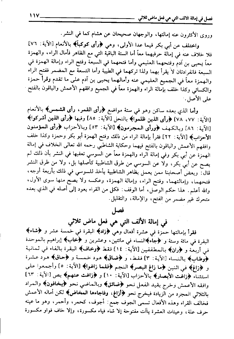 فقرأ بإمالتها حمزة في عشرة أفعال وهي "زاد" البقرة في خمسة عشر و"شاء" البقرة في مائة وستة و"جاء" النساء في مائتين وعشرين و"خاب" إبراهيم بالموحدة في أربعة و"ران" [بالمطففين الآية: 14] فقط "وخاف" البقرة بالفاء في ثمانية "وطاب" [بالنساء الآية: 3] فقط و"ضاق" هود خمسة و"حاق" هود عشرة و"زاغ" في اثنين "مَا زَاغَ الْبَصَر" النجم "فَلَمَّا زَاغُوا" [الآية: 5] وأجمعوا على استثناء "زَاغَتِ الْأَبْصَار" [بالأحزاب الآية: 10] و"زَاغَتْ عَنْهُمُ" بـ[ص الآية: 63] وافقه الأعمش وخرج بقيد الفعل نحو: "ضائق" وبالماضي نحو: "يخافون" والمراد بالثلاثي المجرد من الزيادة فيخرج نحو: "أزاغ، وفاجاءها المخاض" لكن أماله الأعمش فخالف القراء وهذه الأفعال تسمى الجوف جمع: أجوف كحمر وأحمر وهو ما عينه حرف علة, وعينات العشرة ياآت مفتوحة إلا شاء فياء مكسورة وإلا خاف فواو مكسورة أعلمت كلها بالقلب لتحركها وانفتاح ما قبلها, وقرأ ابن ذكوان وكذا خلف بالإمالة كحمزة في "شاء، وجاء" كيف وقعا واختلف فيهما, وفي زاد عن هشام فأمالها عنه الداجوني وفتحها عنه الحلواني, واختلف عن الداجوني عن هشام في "خاب" بالموحدة في مواضعه الأربعة, فأماله عنه صاحب التجريد والروضة والمبهج وغيرهم, وفتحه عنه أبو العز وابن سوار وآخرون, وكذا اختلف فيها عن ابن ذكوان فأمالها عنه الصوري وفتحها الأخفش وأما "زاد" فلا خلاف عن ابن ذكوان في إمالة الأولى بالبقرة وهي "فَزَادَهُمُ اللَّهُ مَرَضًا" [الآية: 10] واختلف عنه في باقي القرآن ففتحه عنه الأخفش من طريق ابن الأخرم وأماله الصوري والنقاش عن الأخفش, واتفق أبو بكر وحمزة والكسائي وكذا خلف على إمالة "بَلْ رَانَ" [المطففين الآية: 14] وافقهم الحسن والباقون بالفتح والله أعلم.