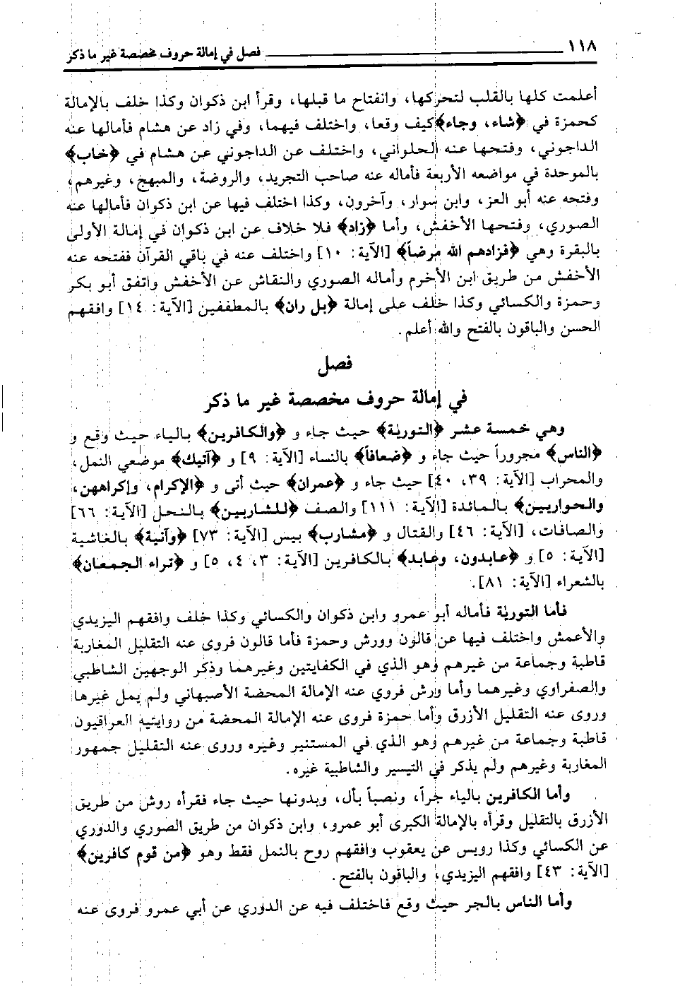 وهي خمسة عشر "التورية" حيث جاء و"والكافرين" بالياء حيث وقع و"الناس" مجرورا حيث جاء و"ضعافا" [النساء الآية: 9] و"آتيك" موضعي النمل والمحراب [الآية: 39، 40] حيث جاء و"عمران" حيث أتى و"الإكرام، وإكراههن، والحواريين" [المائدة الآية: 111] والصف "للشاربين" [النحل الآية:] 66 و [الصافات الآية: 46] والقتال و"مشارب" [يس الآية: 73] "وآنية" [الغاشية الآية: 5] و"عابدون وعابد" [الكافرين الآية: 3، 4، 5] و"تَرَاءَى الْجَمْعَان" [الشعراء الآية: 81] .