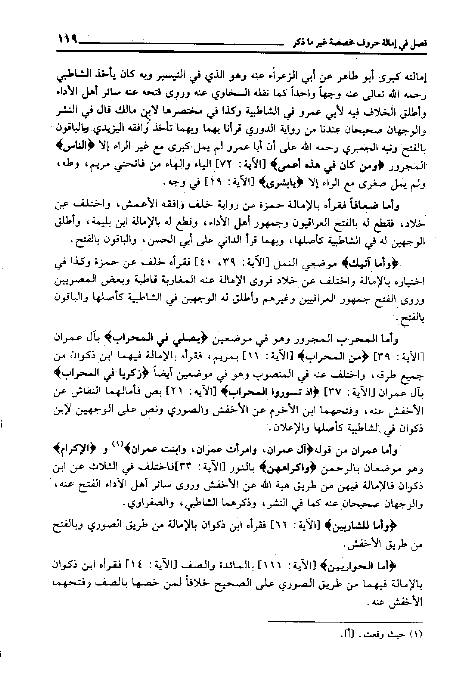 وأما عمران من قوله: "آل عمران، وامرأت عمران، وابنت عمران"1 و"الإكرام" وهو موضعان بالرحمن "وإكراههن" [النور الآية: 33] فاختلف في الثلاث عن ابن ذكوان فالإمالة فيهن من طريق هبة الله عن الأخفش, وروى سائر أهل الأداء الفتح عنه والوجهان صحيحان عنه كما في النشر, وذكرهما الشاطبي والصفراوي.