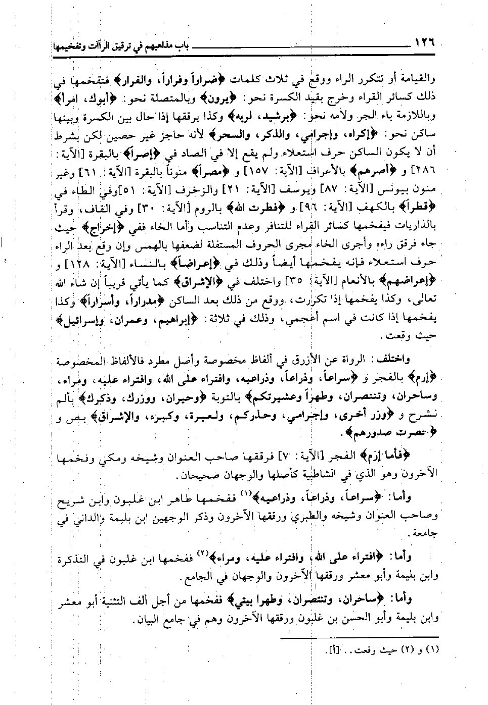 والقيامة أو تتكرر الراء ووقع في ثلاث كلمات "ضرارا وفرارا، والفرار" فتفخمها في ذلك كسائر القراء, وخرج بقيد الكسرة نحو: "يرون" وبالمتصلة نحو: "أبوك، امرأ" وباللازمة باء الجر ولامه نحو: "برشيد، لربه" وكذا يرققها إذا حال بين الكسرة وبينها ساكن نحو: "إكراه، وإجرامي، والذكر، والسحر" لأنه حاجز غير حصين لكن بشرط أن لا يكون الساكن حرف استعلاء, ولم يقع إلا في الصاد في "إصرا" [البقرة الآية: 286] و"أصرهم" [الأعراف الآية: 157] و"مصرا" منونا [البقرة الآية: 61] وغير منون [يونس الآية: 87] و [يوسف الآية: 21] و [الزخرف الآية: 51] وفي الطاء في "قطرا" [الكهف الآية: 96] و"فطرت الله" [الروم الآية: 30] وفي القاف, وقرأ بالذاريات فيفخمها كسائر القراء للتنافر وعدم التناسب, وأما الخاء ففي
