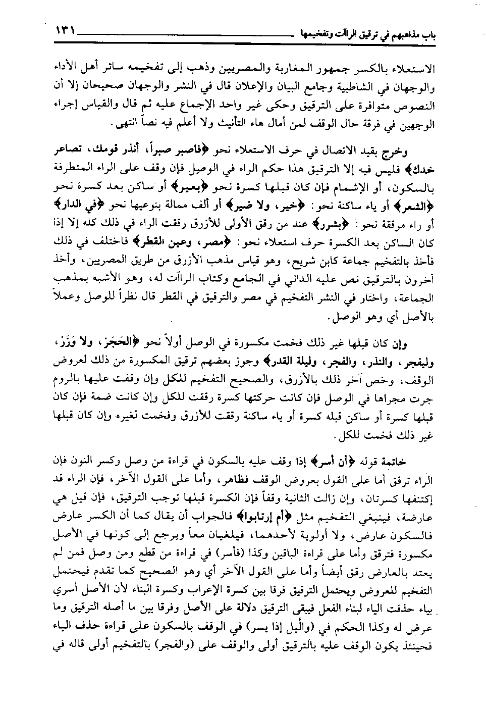 وخرج بقيد الاتصال في حرف الاستعلاء نحو: "فاصبر صبرا، أنذر قومك، تصاعر خدك" فليس فيه إلا الترقيق هذا حكم الراء في الوصل, فإن وقف على الراء المتطرفة بالسكون أو الإشمام فإن كان قبلها كسرة نحو: "بعير" أو ساكن بعد كسرة نحو: "الشعر" أو ياء ساكنة نحو: "خير، ولا ضير" أو ألف ممالة بنوعيها نحو: "في الدار" أو راء مرققة نحو: "بشرر" عند من رقق الأولى للأزرق رققت الراء في ذلك كله إلا إذا كان الساكن بعد الكسرة حرف استعلاء نحو: "مصر، وعين القطر" فاختلف في ذلك فأخذ بالتفخيم جماعة كابن شريح وهو قياس مذهب الأزرق من طريق المصريين, وأخذ آخرون بالترقيق نص عليه الداني في الجامع وكتاب الراءات له وهو الأشبه بمذهب الجماعة, واختار في النشر التفخيم في مصر والترقيق في القطر قال: نظرا للوصل وعملا بالأصل أي: وهو الوصل.