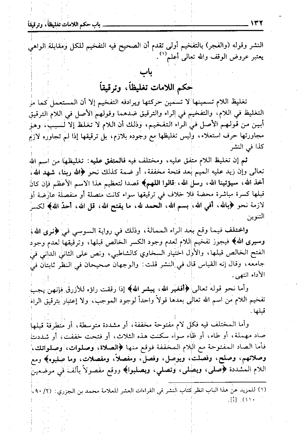 تغليظ اللام تسمينها لا تسمين حركتها ويرادفه التفخيم, إلا أن المستعمل كما مر التغليظ في اللام والتفخيم في الراء والترقيق ضدهما, وقولهم الأصل في اللام الترقيق أبين من قولهم الأصل في الراء التفخيم, وذلك أن اللام لا تغلظ إلا لسبب وهو مجاورتها حرف استعلاء وليس تغليظها مع وجوده بلازم, بل ترقيقها إذا لم تجاوره لازم كذا في النشر.