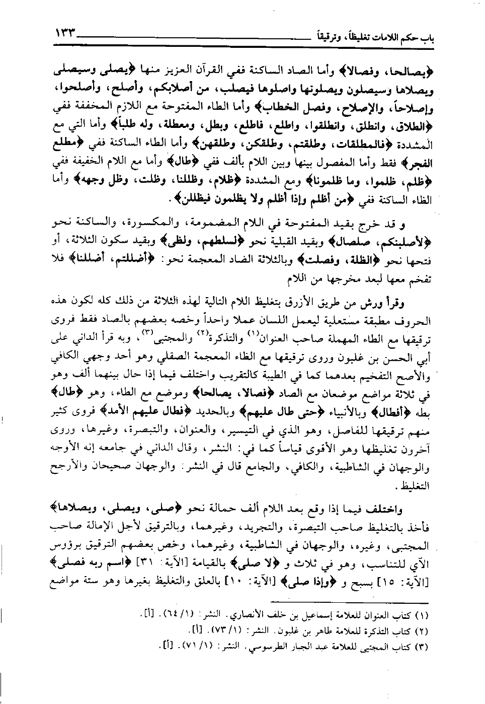 "يصالحا، وفصالا" وأما الصاد الساكنة ففي القرآن العزيز منها "يصلى، وسيصلى، ويصلاها، وسيصلون، ويصلونها، واصلوها، فيصلب، من أصلابكم، وأصلح، وأصلحوا، وإصلاحا، والإصلاح، وفصل الخطاب" وأما الطاء المفتوحة مع اللازم المخففة ففي "الطلاق، وانطلق، وانطلقوا، واطلع، فاطلع، وبطل، ومعطلة، وله طلبا" وأما التي مع المشددة "فالمطلقات، وطلقتم، وطلقكن، وطلقهن" وأما الطاء الساكنة ففي "مطلع الفجر" فقط, وأما المفصول بينها وبين اللام بألف ففي "طال" وأما مع اللام الخفيفة ففي "ظلم، ظلموا، وما ظلمونا" ومع المشددة "ظلام، وظللنا، وظلت، وظل وجهه" وأما الظاء الساكنة ففي "من أظلم وإذا أظلم ولا يظلمون فيظللن".