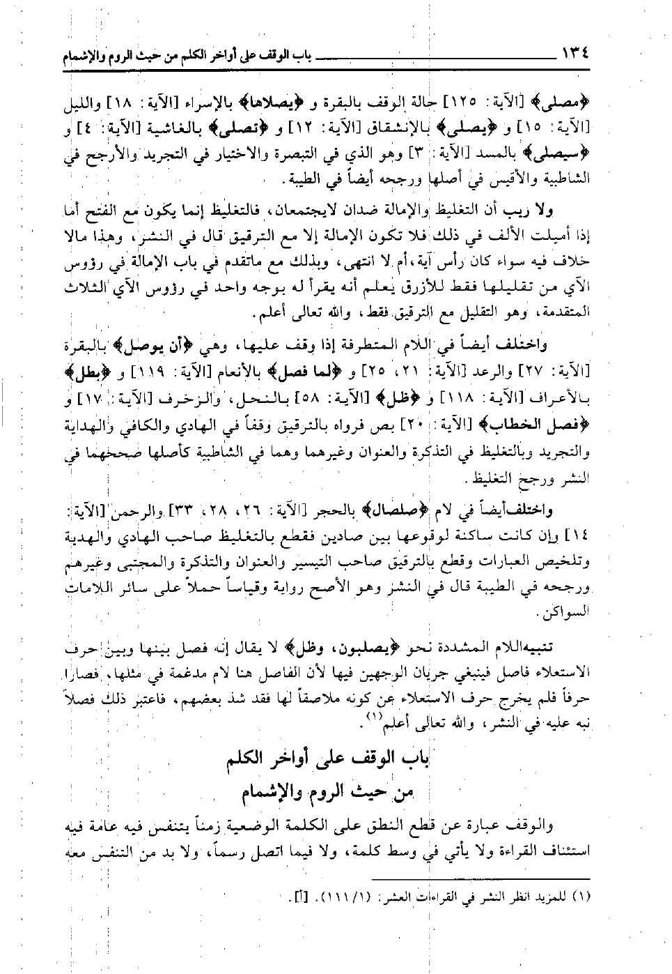 واختلف أيضا في اللام المتطرفة إذا وقف عليها، وهي "أن يوصل" [البقرة الآية: 27] و [الرعد الآية: 21, 25] و"لما فصل" [الأنعام الآية: 119] و"بطل" [الأعراف الآية: 118] و"ظل" [الآية: 58 بالنحل والزخرف الآية: 17] و"وَفَصْلَ الْخِطَابِ" [ص الآية: 20] فرواه بالترقيق وقفا في الهادي والكافي والهداية والتجريد, وبالتغليظ في التذكرة والعنوان وغيرهما, وهما في الشاطبية كأصلها صححهما في النشر ورجح التغليظ.