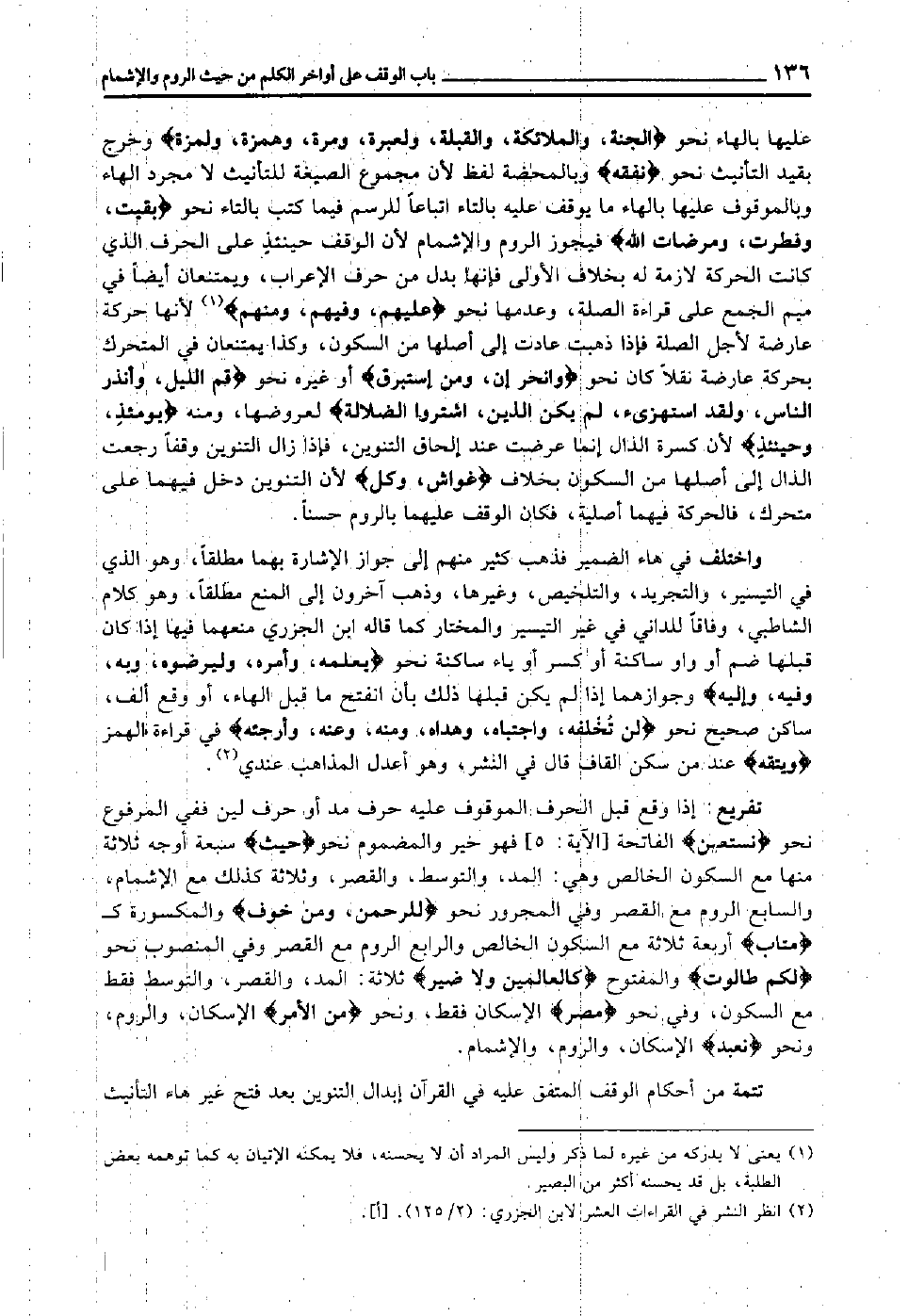 عليها بالهاء نحو: "الجنة، والملائكة، والقبلة، ولعبرة، ومرة، وهمزة، ولمزة" وخرج بقيد التأنيث نحو: "نفقه" وبالمحضة لفظ؛ لأن مجموع الصيغة للتأنيث لا مجرد الهاء, وبالموقوف عليها بالهاء ما يوقف عليه بالتاء اتباعا للرسم فيما كتب بالتاء نحو: "بقيت, وفطرت, ومرضات الله" فيجوز الروم والإشمام؛ لأن الوقف حينئذ على الحرف الذي كانت الحركة لازمة له بخلاف الأولى فإنها بدل من حرف الإعراب, ويمتنعان أيضا في ميم الجمع على قراءة الصلة وعدمها نحو: "عليهم، وفيهم، ومنهم"1 لأنها حركة عارضة لأجل الصلة, فإذا ذهبت عادت إلى أصلها من السكون وكذا يمتنعان في المتحرك بحركة عارضة نقلا كان نحو: "وانحر إن، ومن إستبرق" أو غيره نحو: "قم الليل، وأنذر الناس، ولقد استهزئ، لم يكن الذين، اشتروا الضلالة" لعروضها، ومنه "يومئذ، وحينئذ" لأن كسرة الذال إنما عرضت عند إلحاق التنوين, فإذا زال التنوين وقفا رجعت الذال إلى أصلها من السكون بخلاف "غواش وكل" لأن التنوين دخل فيهما على متحرك, فالحركة فيهما أصلية فكان الوقف عليهما بالروم حسنا.