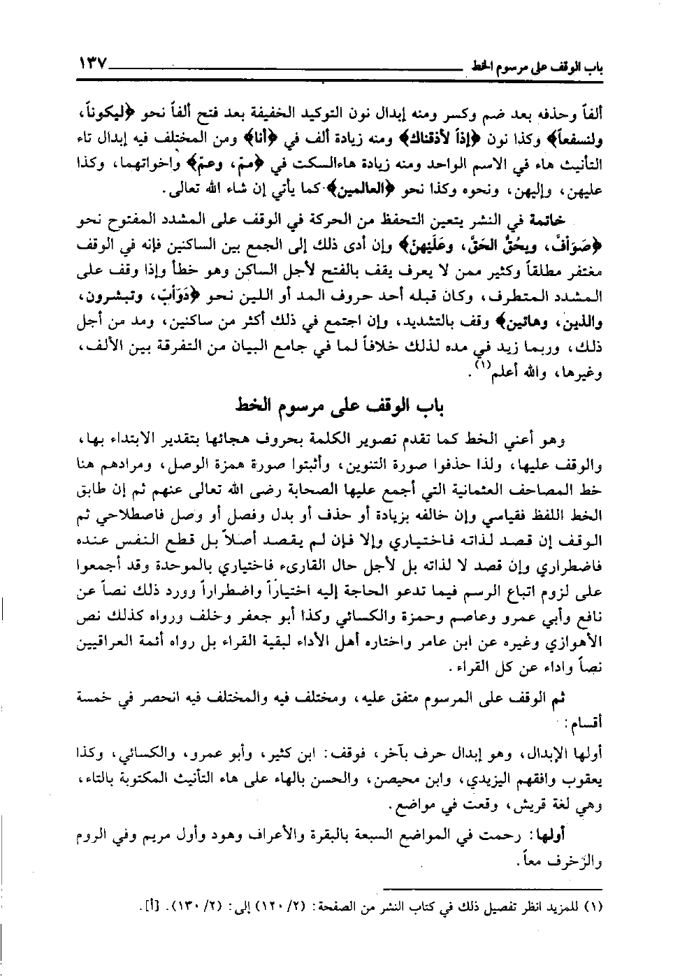 ثم الوقف على المرسوم متفق عليه ومختلف فيه, والمختلف فيه انحصر في خمسة أقسام: