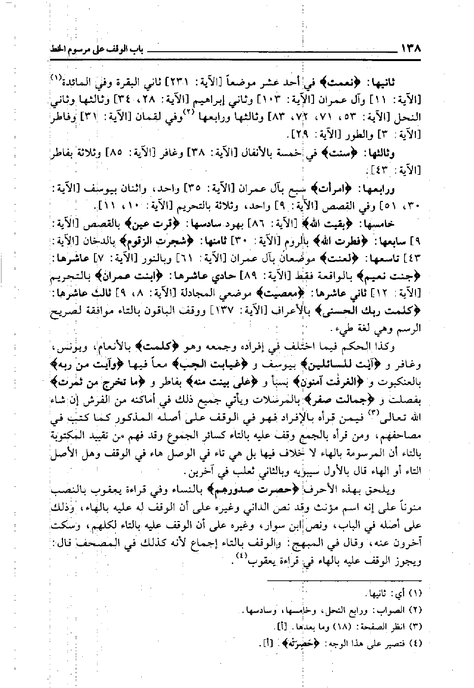 خامسها "بَقِيَّتُ اللَّه" [الآية: 86 بهود] سادسها "قُرَّتُ عَيْن" [بالقصص الآية: 9] سابعها "فِطْرَتَ اللَّه" [بالروم الآية: 30] ثامنها "شَجَرَةُ الزَّقُّوم" [بالدخان الآية: 43] تاسعها "لعنت" موضعان بـ[آل عمران الآية: 61] و [بالنور الآية: 7] عاشرها "جَنَّةَ نَعِيم" [بالواقعة فقط الآية: 89] حادي عاشرها "ابْنَتَ عِمْرَان" [بالتحريم الآية: 12] ثاني عاشرها "معصيت" موضعي [المجادلة الآية: 8، 9] ثالث عاشرها "كَلِمَتُ رَبِّكَ الْحُسْنَى" [بالأعراف الآية: 137] ووقف الباقون بالتاء موافقة لصريح الرسم وهي لغة طيء.
