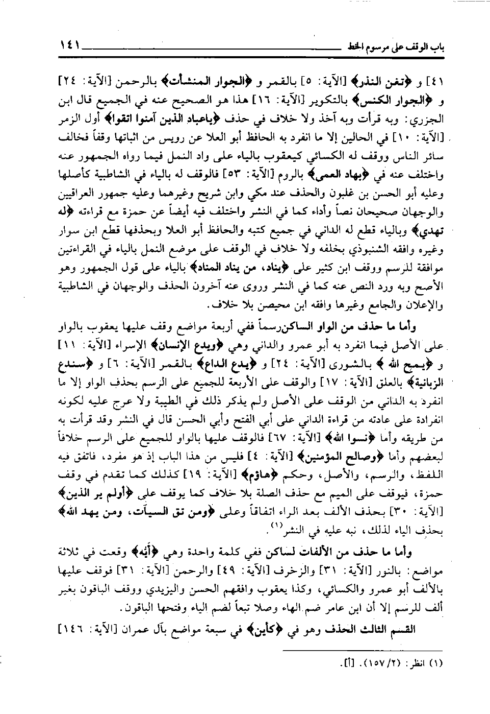 41] و"تُغْنِ النُّذُر" [الآية: 5 بالقمر] و"الْجَوَارِ الْمُنْشَآت" [الرحمن الآية: 24] و"الْجَوَارِ الْكُنَّس" [التكوير الآية: 16] هذا هوالصحيح عنه في الجميع, قال ابن الجزري: وبه قرأت وبه آخذ ولا خلاف في حذف "يَا عِبَادِ الَّذِينَ آمَنُوا اتَّقُوا" [أول الزمر الآية: 10] في الحالين إلا ما انفرد به الحافظ أبو العلا عن رويس من إثباتها وقفا فخالف سائر الناس, ووقف له الكسائي كيعقوب بالياء على واد النمل, فيما رواه الجمهور عنه واختلف عنه في "بهاد العمي" [الروم الآية: 53] فالوقف له بالياء في الشاطبية كأصلها, وعليه أبو الحسن بن غلبون, والحذف عند مكي وابن شريح وغيرهما, وعليه جمهور العراقيين, والوجهان صحيحان نصا وأداء كما في النشر, واختلف فيه أيضا عن حمزة مع قراءته "له تهدي" وبالياء قطع له الداني في جميع كتبه والحافظ أبو العلا, وبحذفها قطع ابن سوار وغيره وافقه الشنبوذي بخلفه, ولا خلاف في الوقف على موضع النمل بالياء في القراءتين موافقة للرسم, ووقف ابن كثير على "يناد، من يناد المناد" بالياء على قول الجمهور وهو الأصح, وبه ورد النص عنه كما في النشر وروى عنه آخرون الحذف والوجهان في الشاطبية والإعلان والجامع وغيرها وافقه ابن محيصن بلا خلاف.