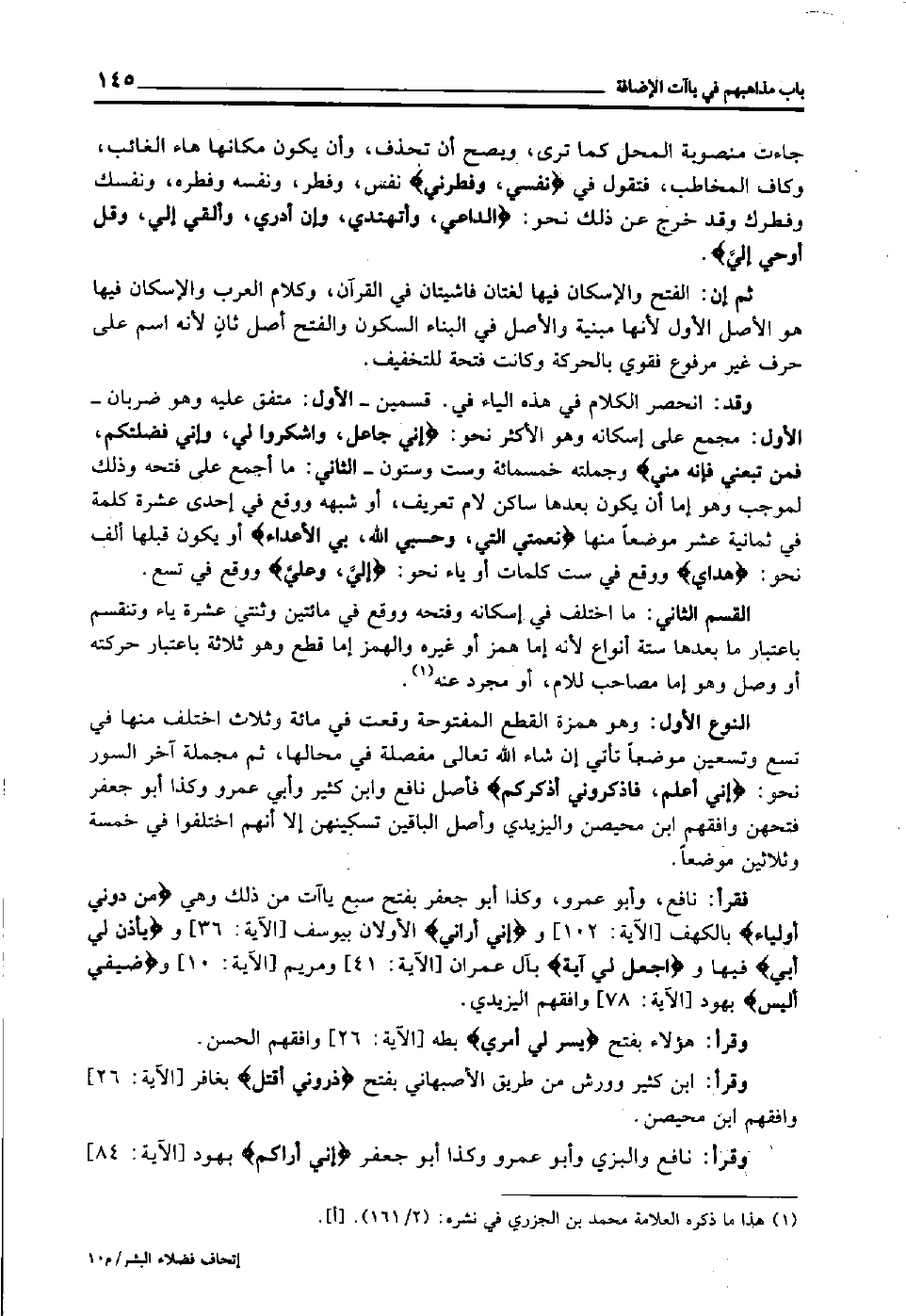 وقد انحصر الكلام في هذه الياء في قسمين: الأول: متفق عليه وهو ضربان: الأول: مجمع على إسكانه, وهو الأكثر نحو: "إني جاعل، واشكروا لي، وإني فضلتكم، فمن تبعني فإنه مني" وجملته خمسمائة وست وستون, الثاني: ما أجمع على فتحه, وذلك لموجب, وهو إما أن يكون بعدها ساكن لام تعريف أو شبهه, ووقع في إحدى عشرة كلمة في ثمانية عشر موضعا منها "نعمتي التي، وحسبي الله، بي الأعداء" أو يكون قبلها ألف نحو: "هداي" ووقع في ست كلمات أو ياء نحو: "إلي، وعلي" ووقع في تسع.