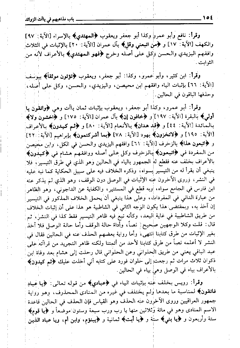 وقرأ: أبو عمرو وكذا أبو جعفر ويعقوب بإثبات ثمان ياءات وهي: "وَاتَّقُونِ يَا أُولِي" [بالبقرة الآية: 197] و"وَخَافُونِ إِن" [بآل عمران الآية: 175] و"وَاخْشَوْنِ وَلا" [بالمائدة الآية: 44] و"قَدْ هَدَان" [بالأنعام الآية: 80] و"ثُمَّ كِيدُون" [بالأعراف الآية: 195] و"لا تُخْزُون" [بهود الآية: 78] "بِمَا أَشْرَكْتُمُون" [بإبراهيم الآية: 22] و"وَاتَّبِعُونِ هَذَا" [بالزخرف الآية: 61] وافقهم اليزيدي والحسن في الكل وابن محيصن من المفردة في "اتبعون" بالزخرف, وكل على أصله, ووافقهم هشام في "كيدون" بالأعراف بخلف عنه, فقطع له الجمهور بالياء في الحالين وهو الذي في طرق التيسير, فلا ينبغي أن يقرأ له من التيسير بسواه, وذكره الخلاف فيه على سبيل الحكاية كما نبه عليه في النشر, وروى الآخرون عنه الإثبات في الوصل دون الوقف, وهو الذي لم يذكر عنه ابن فارس في الجامع سواه, وبه قطع في المستنير والكفاية عن الداجوني وهو الظاهر من عبارة الداني في المفردات, وعلى هذا ينبغي أن يحمل الخلاف المذكور في التيسير إن أخذ به, وبمقتضى هذا يكون الوجه الثاني في الشاطبية هو هذا, على أن إثبات الخلاف من طريق الشاطبية في غاية البعد, وكأنه تبع فيه ظاهر التيسير فقط, كذا في النشر ثم قال: قلت وكلا الوجهين صحيح نصا وأداء حالة الوقف, وأما حالة الوصل فلا آخذ بغير الإثبات من طرق كتابنا ا. هـ. وأما رواية بعضهم الحذف عنه في الحالين فقال في النشر: لا أعمله نصا من طرق كتابنا لأحد من أئمتنا, ولكنه ظاهر التجريد من قراءاته على عبد الباقي يعني من طريق الحلواني, وعن الحلواني قال: رحلت إلى هشام بعد وفاة ابن ذكوان ثلاث مرات, ثم رجعت إلى حلوان فورد علي كتابه أني أخذت عليك "ثُمَّ كِيدُون" بالأعراف بياء في الوصل وهي بياء في الحالين.