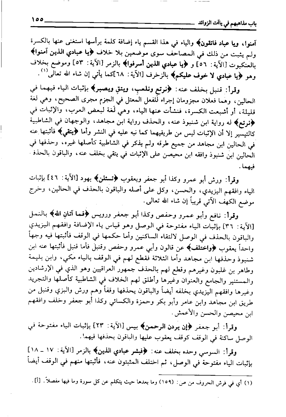 آمنوا، ويا عباد فاتقون" والياء في هذا القسم ياء إضافة كلمة برأسها, استغنى عنها بالكسرة, ولم يثبت من ذلك في المصاحف سوى موضعين بلا خلاف "يَا عِبَادِيَ الَّذِينَ آمَنُوا" [بالعنكبوت الآية: 56] و"يَا عِبَادِيَ الَّذِينَ أَسْرَفُوا" [بالزمر الآية: 53] وموضع بخلاف وهو "يا عبادي لا خوف عليكم" [بالزخرف الآية: 68] كما يأتي إن شاء الله تعالى1.