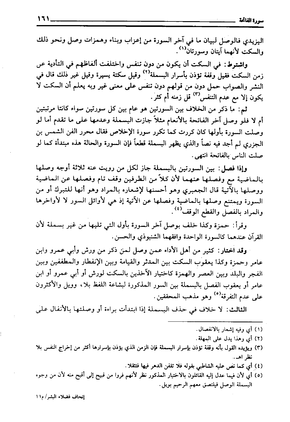 وقد اختار: كثير من أهل الأداء عمن وصل لمن ذكر من ورش وأبي عمرو وابن عامر وحمزة, وكذا يعقوب السكت بين المدثر والقيامة وبين الانفطار والمطففين, وبين الفجر والبلد وبين العصر والهمزة, كاختيار الآخذين بالسكت لورش أو أبي عمرو أو ابن عامر أو يعقوب الفصل بالبسملة بين السور المذكورة, لبشاعة اللفظ بلا, وويل والأكثرون على عدم التفرقة5 وهو مذهب المحققين.